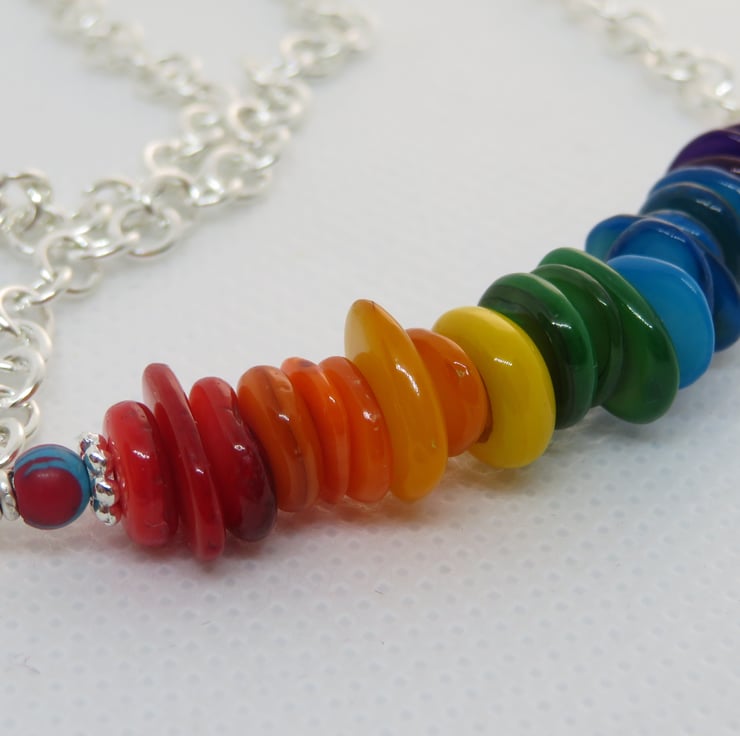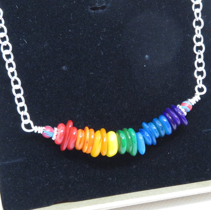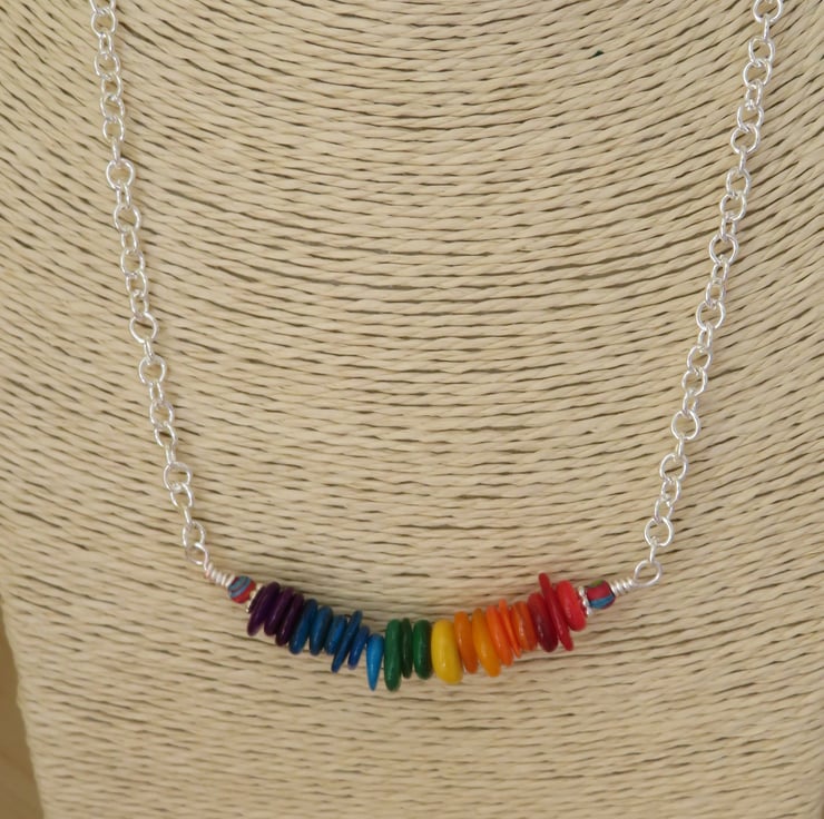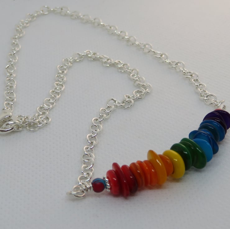 All the colours of the rainbow in this pretty shell necklace. Dyed shell chips have been threaded onto silver plated copper wire, finished at each end with silver plated flower spacers and rainbow coloured polymer clay beads. Each end of the wire is neatly finished with a wrapped loop and attached to a silver plated rolo chain with a simple lobster clasp. The rainbow shell section measures 7cm and the total length of the necklace is 44cm.