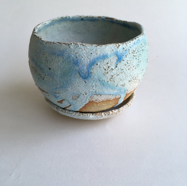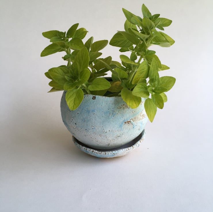 Rounded planter hand built from stoneware clay, inspired by seashore and skies.