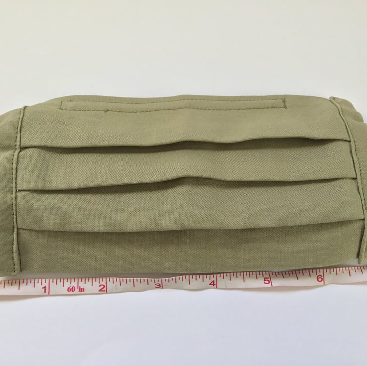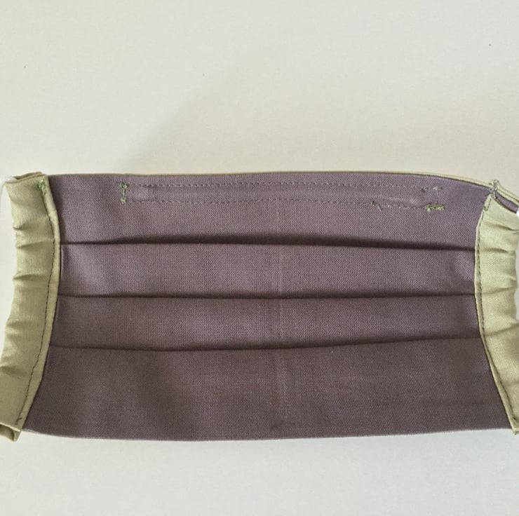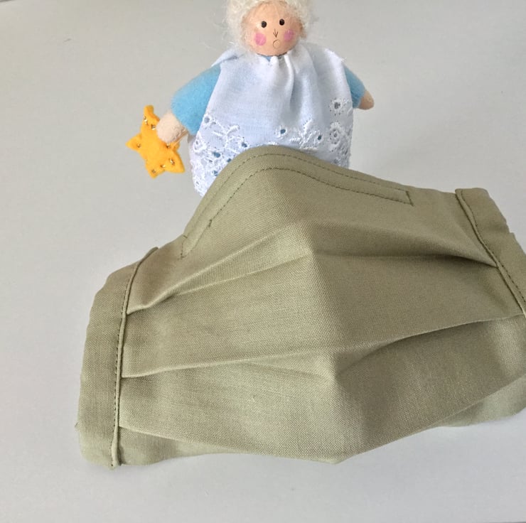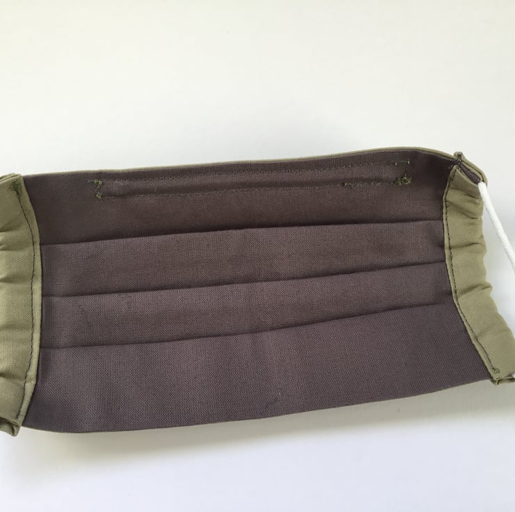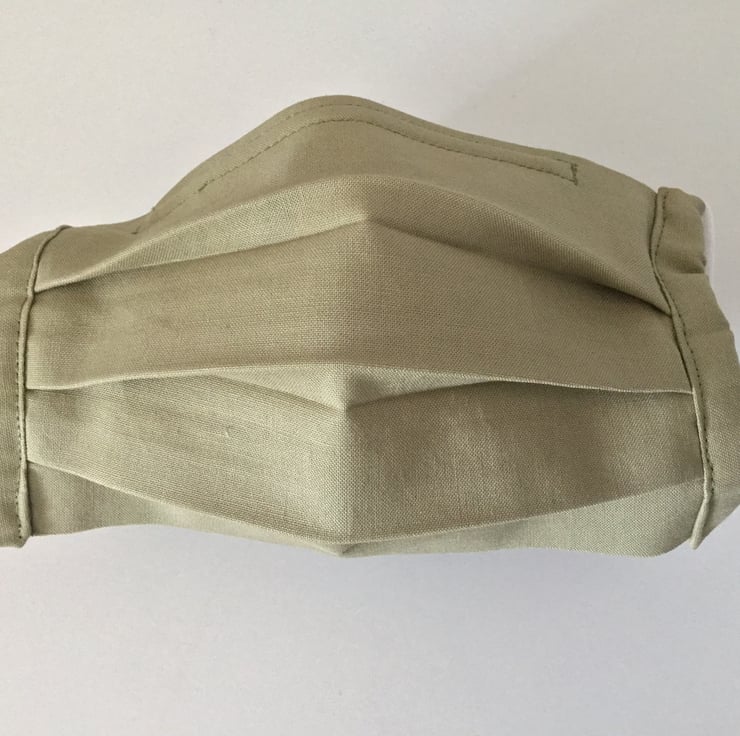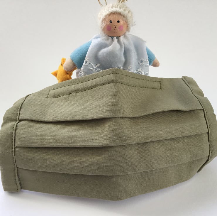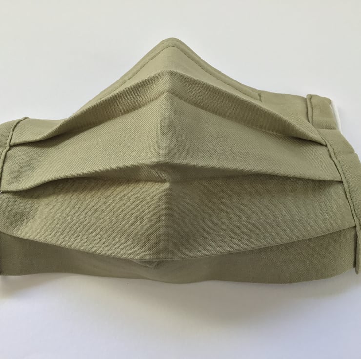 Khaki face covering with elastic ear loops and nose wire. The fabrics used are by Moda, a quality quilting cotton.