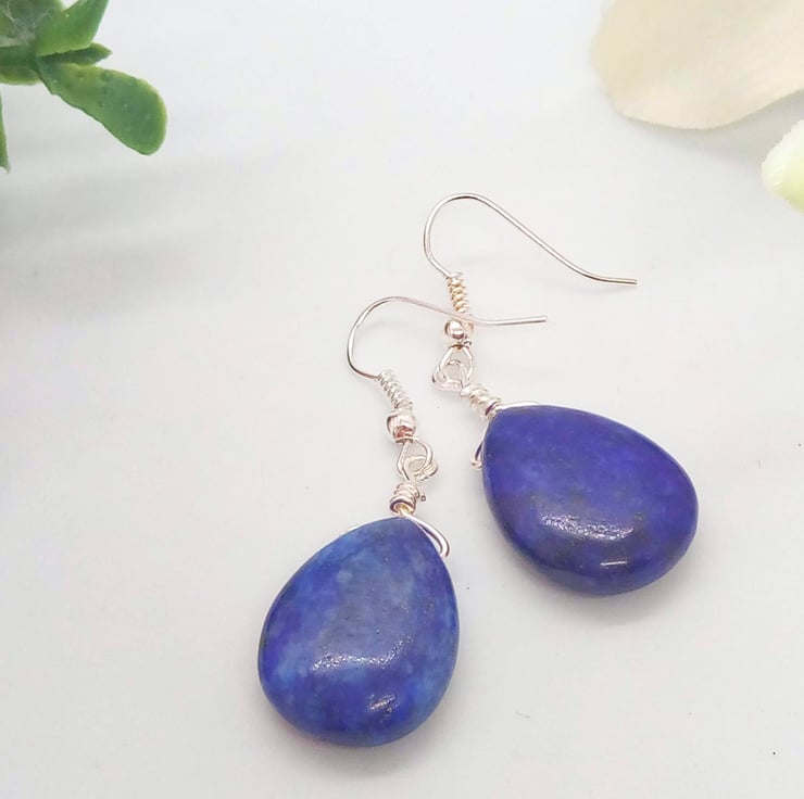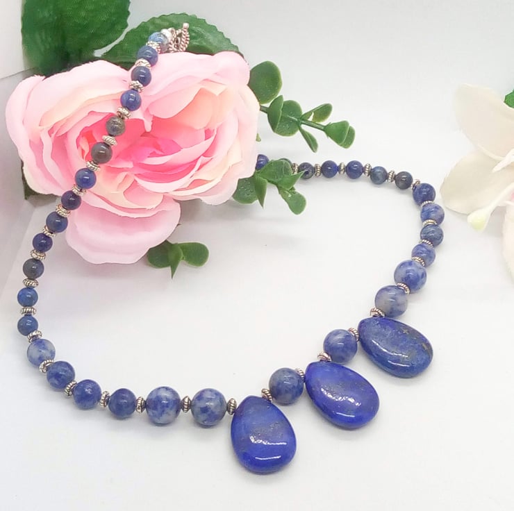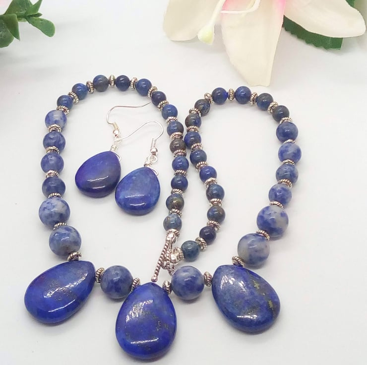 This beautiful jewellery set comprises a necklace and pair of earrings. The necklace is made using beautiful Lapis Lazuli 25 mm x 20 mm teardrop, 6 mm, 8 mm, and 10 mm round sodalite beads and small 6 mm x 4 mm silver plated spacer beads and it is fastened with a silver plated toggle clasp. The earrings are made with a single 20 mm x 15 mm lapis lazuli tear drop bead suspended on silver plated hook ear wires. The necklace is 17.25 inches (44 cm) in length and the earrings have a 1.75 inch (3 cm) drop from the base of the ear wire. The jewellery set will be dispatched wrapped in tissue paper in an organza bag. The pretty set would look great for a special occasion. It would also make an ideal gift for your friends or relatives for a birthday or anniversary, or a lovely treat for yourself.