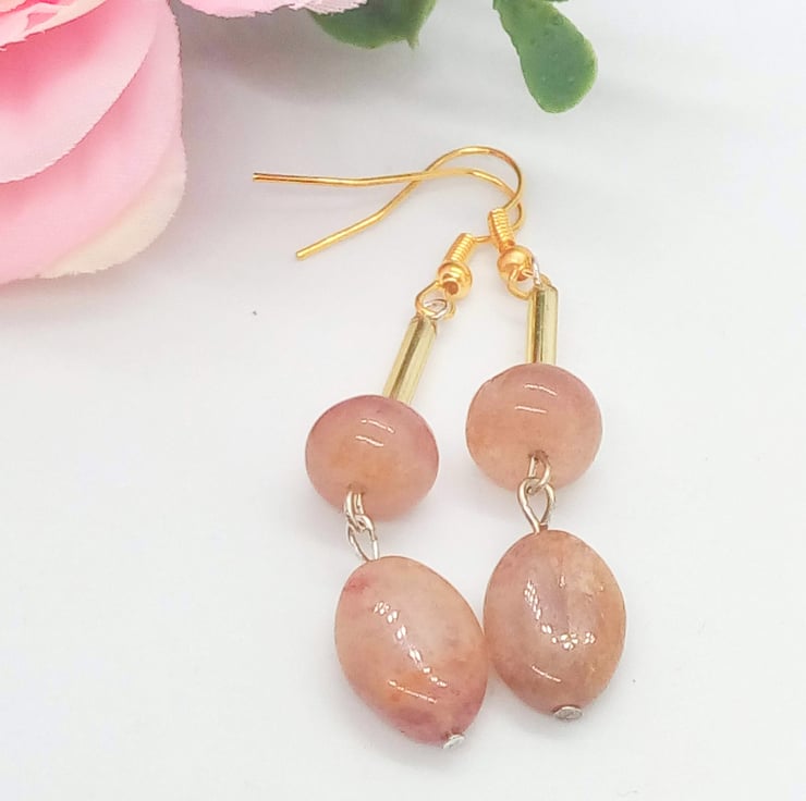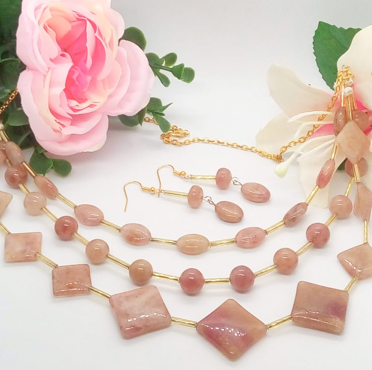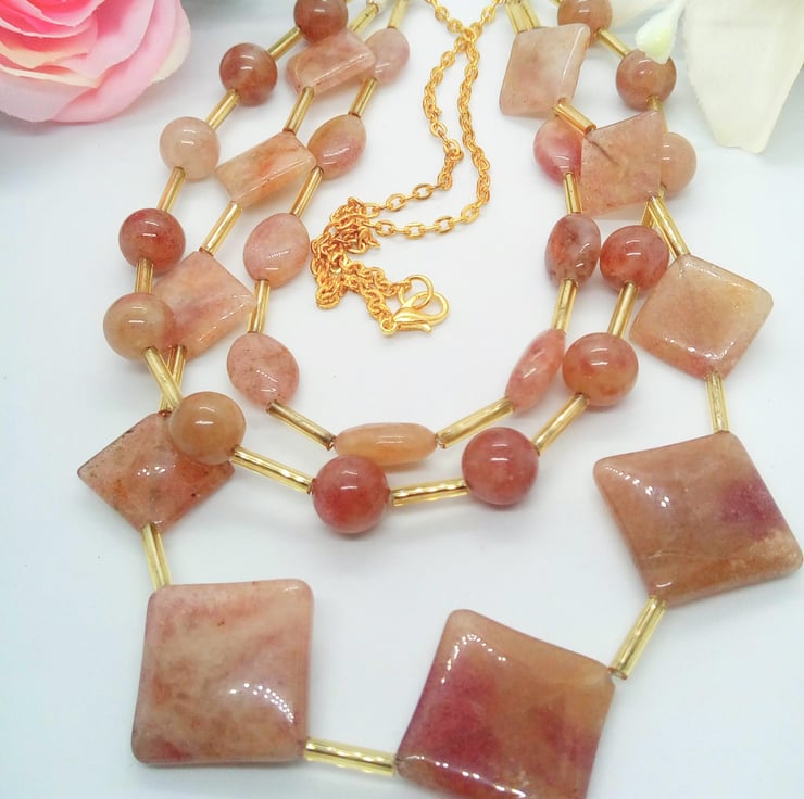 This beautiful jewellery set comprises a 3 strand necklace and pair of earrings. The 3 strand necklace is made with strawberry quartz 20 mm x 20 mm diamond shaped beads, 10 mm round strawberry quartz beads, 15 mm x 10 mm oval strawberry quartz beads, 10 mm bugle beads and gold plated chain. The earrings are made using 10 mm x 6 mm strawberry quartz beads, 15 mm x 10 mm oval strawberry quartz beads and 10 mm bugle beads. The necklace is 21.75 inches (55 cm) in length and the earrings have a drop of 1.5 inch (4 cm) from the base of the ear wire. The jewellery set will be dispatched wrapped in tissue paper in an organza bag and delivered to you via Royal Mail first class post. The necklace and earrings set would make a lovely gift idea for someone special and it would also look great with any outfit for a special occasion.