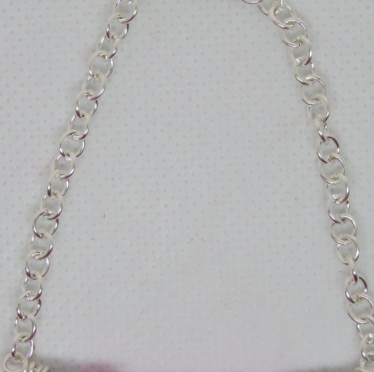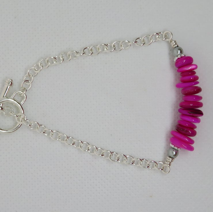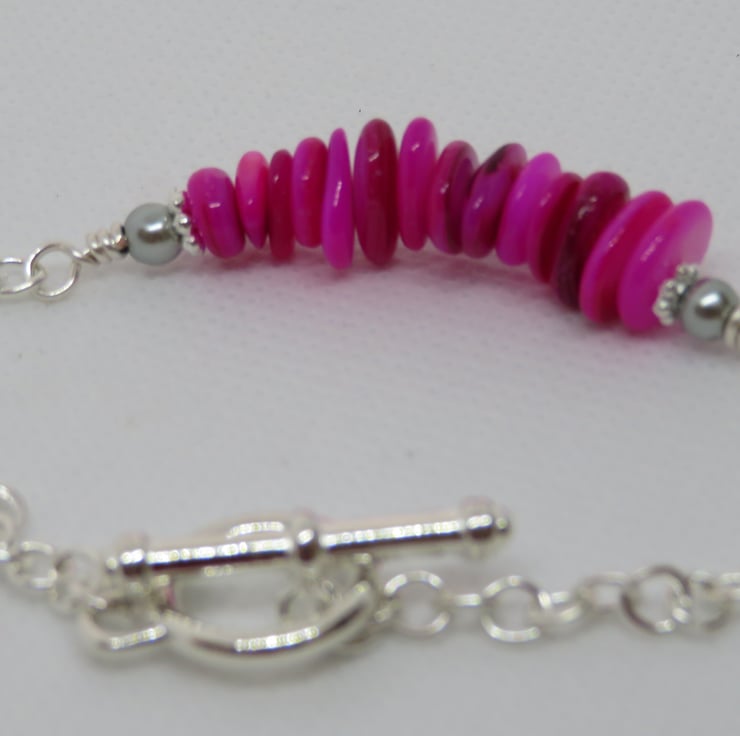 Cerise pink shell chips form a pretty line in this easy to wear bracelet. The shell chips are threaded onto silver plated copper wire and complemented at each end with silver plated flower spacers and grey glass pearls. The wire is neatly finished with wrapped loops and attached to silver plated rolo chain. This easy to wear piece fastens with a silver plated toggle clasp. The shell and bead section of this bracelet measures 4.2cm and the total length is 19cm.