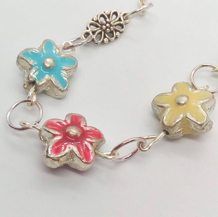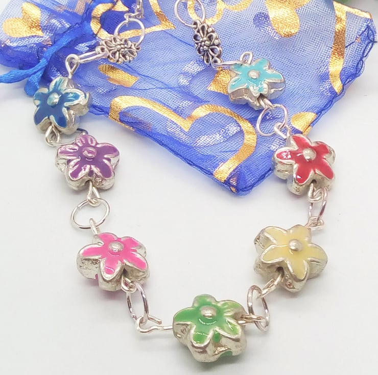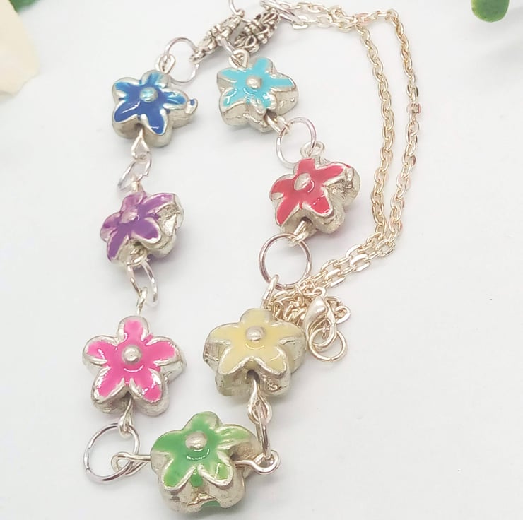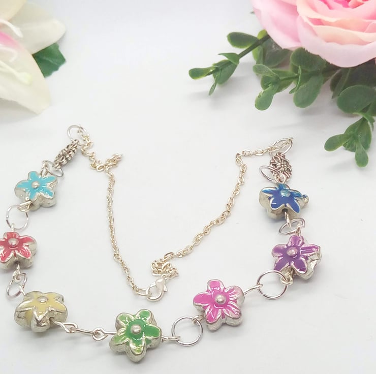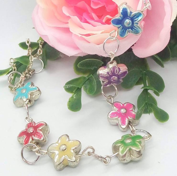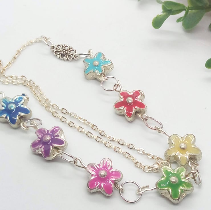 This pretty necklace is made using 15mm multi coloured metal flower beads with silver plated chain. The necklace has a silver plated lobster clasp.