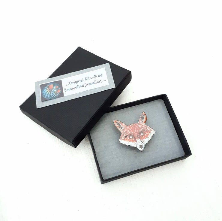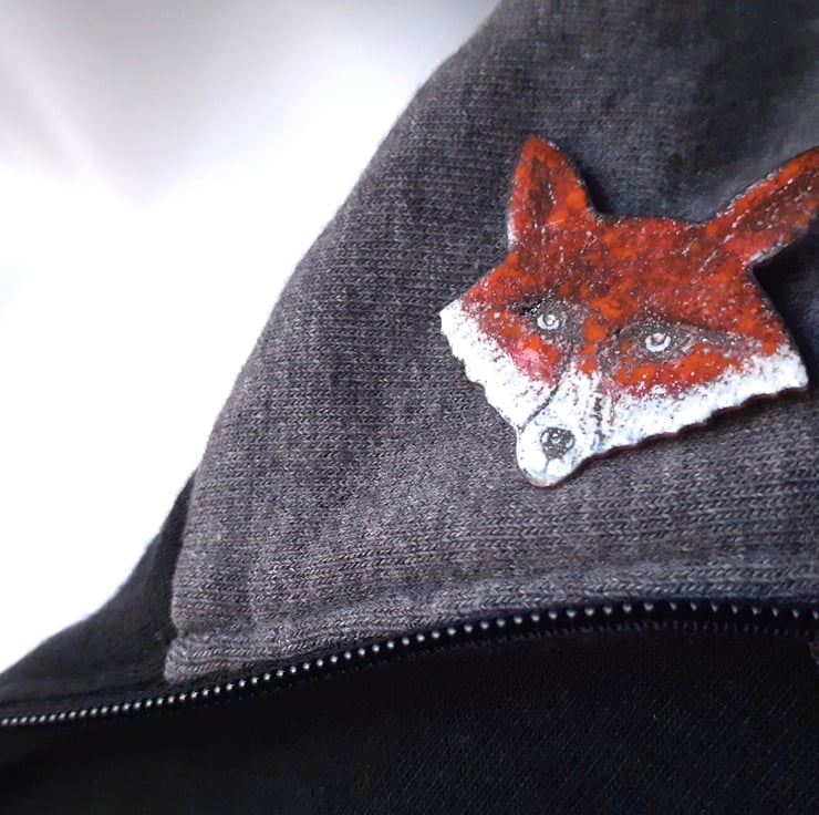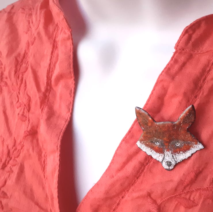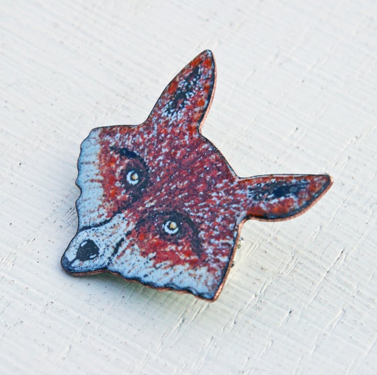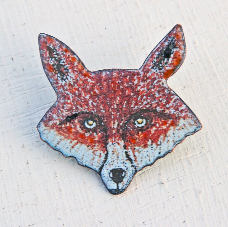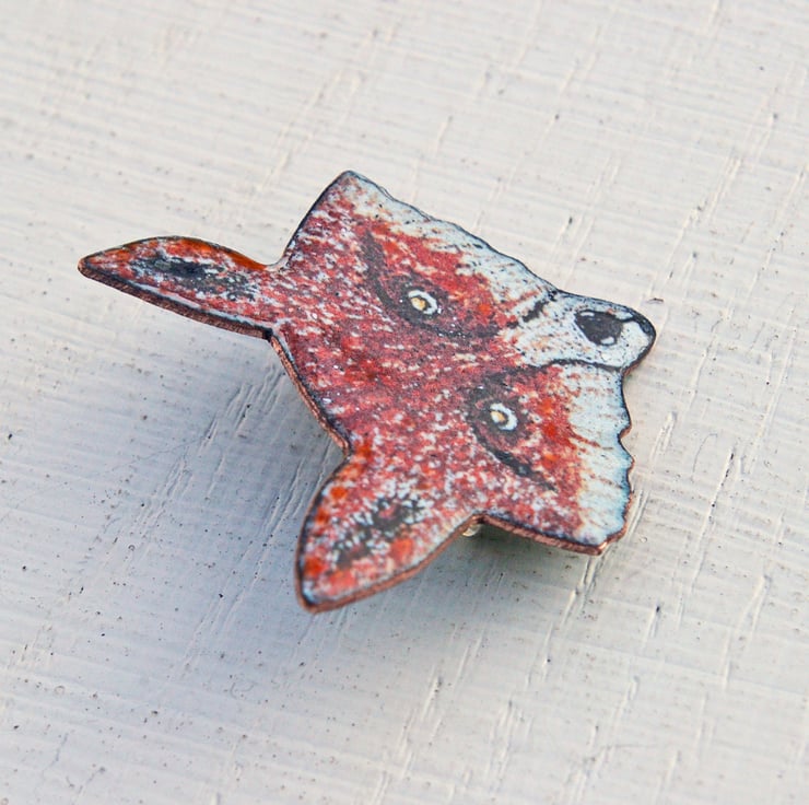 I have hand-cut the copper shape for this Fox head brooch, so you can be sure that this new addition to my wildlife range, is unique to my jewellery designs. It measures approximately 3.5cm x 3.5cm and is enamelled in rich orange-reds and white. The detail of the foxy face is applied in the final layer of enamel, after a process involving several layers on both sides and firing in between. The enamel on the reverse is a mixed colour and adds strength and durability to the brooch. A silver-plated brooch pin is attached. The brooch is sent packaged in a quality card gift box with an outer card packaging box and sent by 'Signed for' Royal Mail postage.