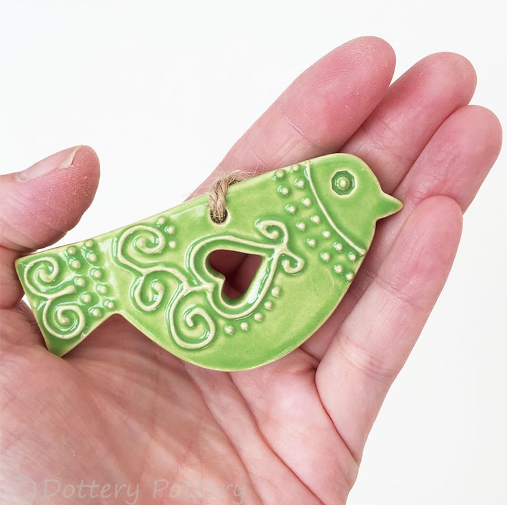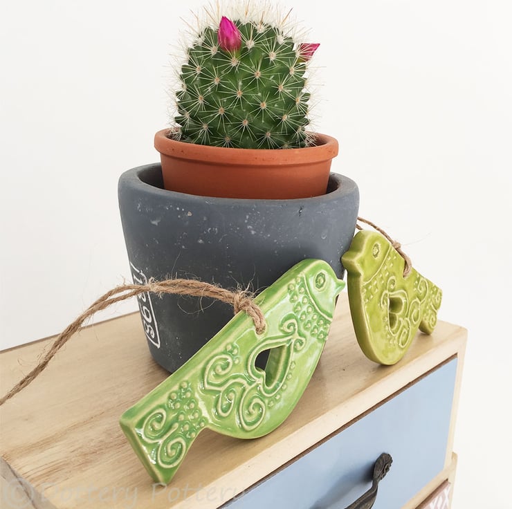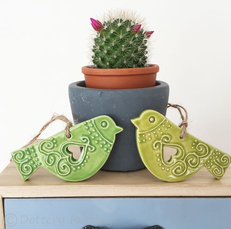 This listing is for a set of two sweet little bird decorations. They are made from white earthenware clay, embellished with pattern and finished with a bright, glossy glaze. They have been fired twice, once to the bisque stage and then a second firing for the glaze. Each bird measures 8.5 centimetres wide x 5.5cm high x 5mm thick. Suitable for indoor or outdoor use.