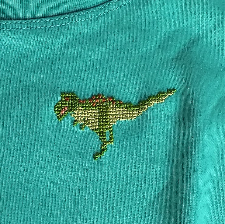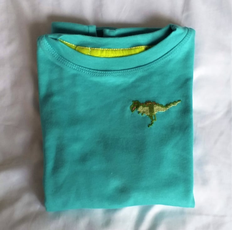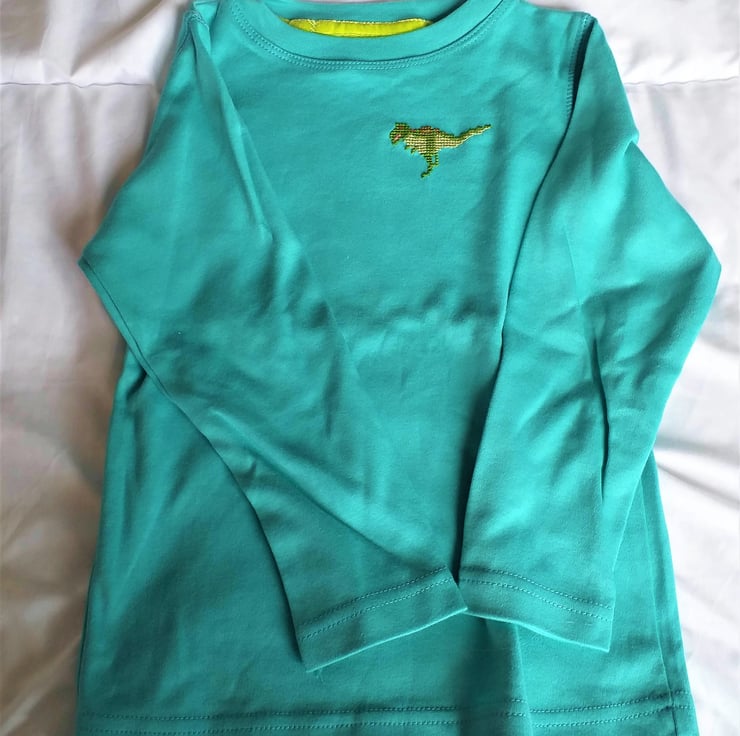 I thought I'd try a new venture, and embroider T-shirts with long sleeves, including a few for slightly older kids. This lovely turquoise shirt asked for a bright green dinosaur!