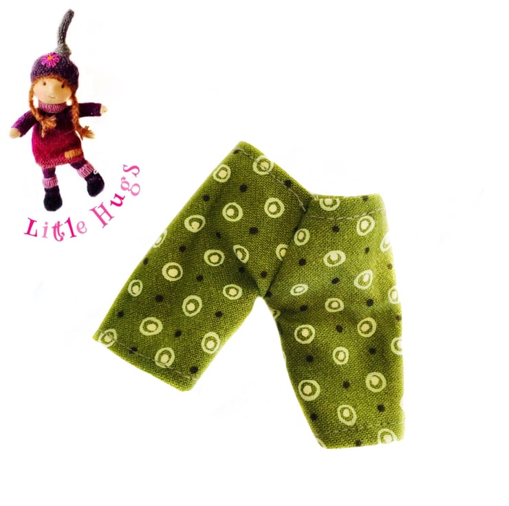 A little pair of olive green trousers made especially to fit the Little Hugs. The trousers are made from cotton in a swirl print.