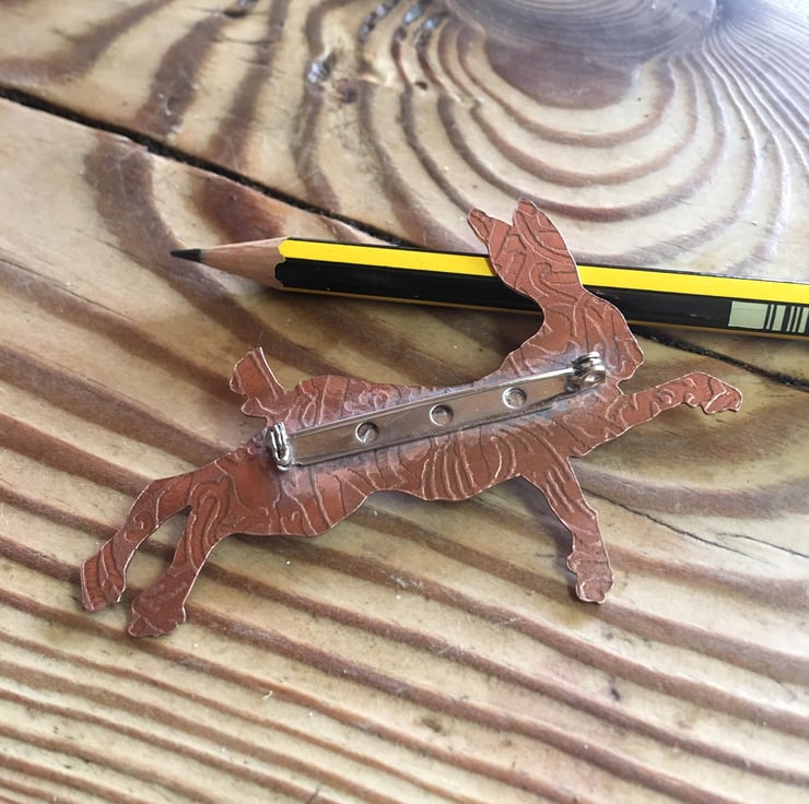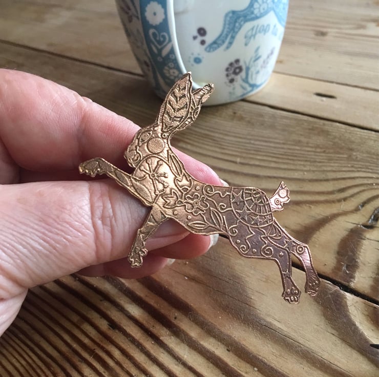 Leaping hare brooch pin, hand sawn from copper sheet metal. The brooch is richly decorated with my original designs of leaves and seed heads, stars moons and flowers. The back is also etched with a lovely floral design and is finished with a silver plated fastener which is firmly soldered on not glued.