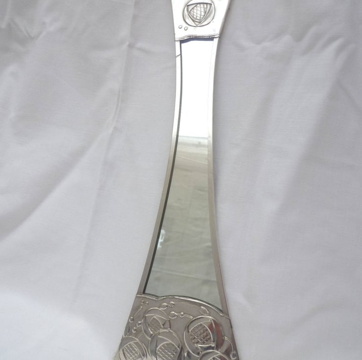 Mackintosh rose design mirror made of hand tooled English pewter. A pretty wall mirror that can hang on any wall in your home. This would make a really unusual gift............ideal for a wedding present.