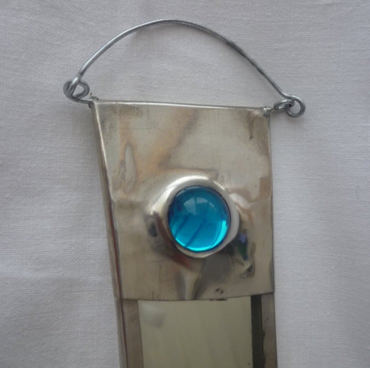 This mirror is approx 16 inches high and 4 inches at its base.The one pictured has a turquoise stone set at the top, however I can make with another colour or a pewter rose pattern at the top instead of a stone.