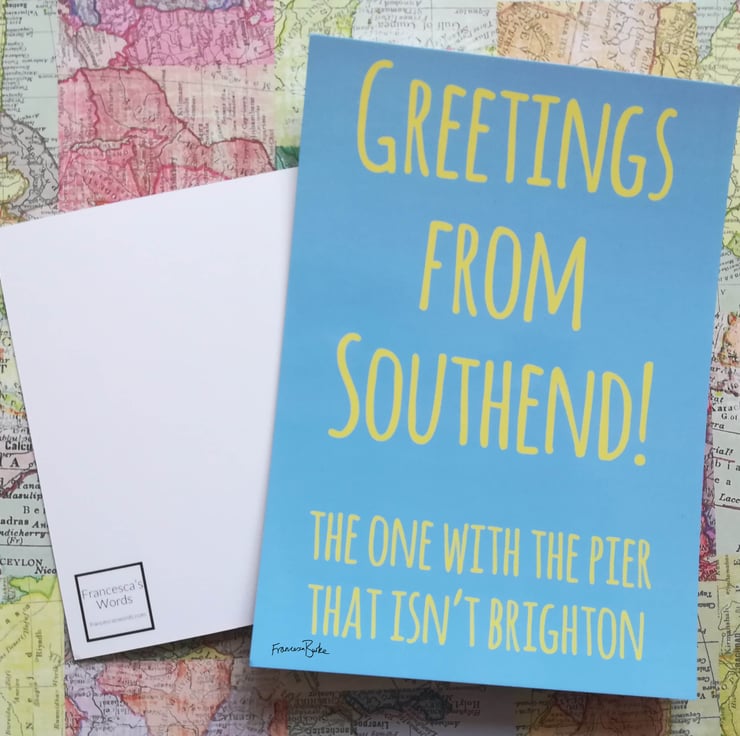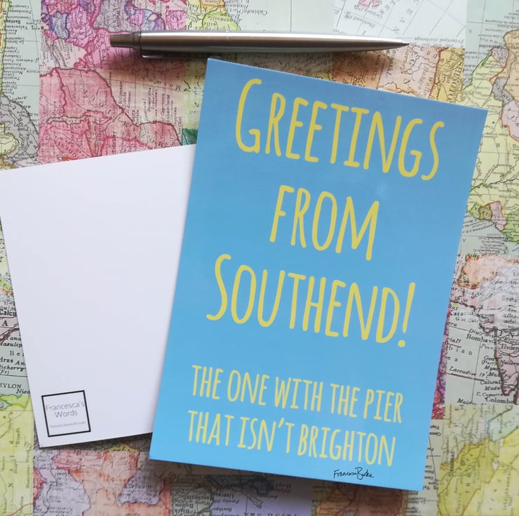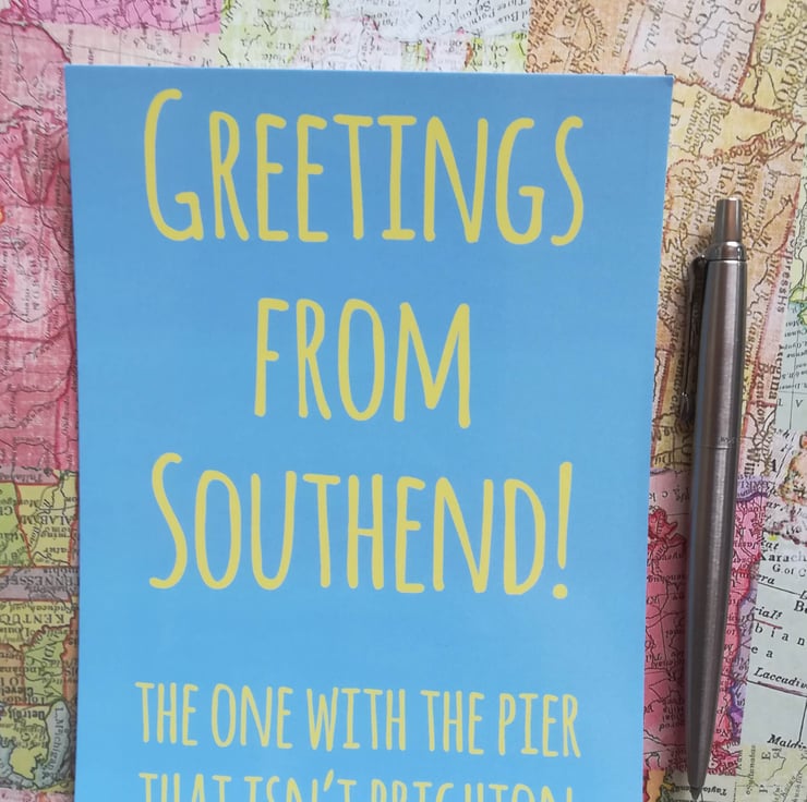 Card will not be watermarked. Actual print colour may vary from monitor to monitor and because each set is made to order. Stamps not included. Print reads 'Greetings from Southend! The one with the pier that isn't Brighton.'