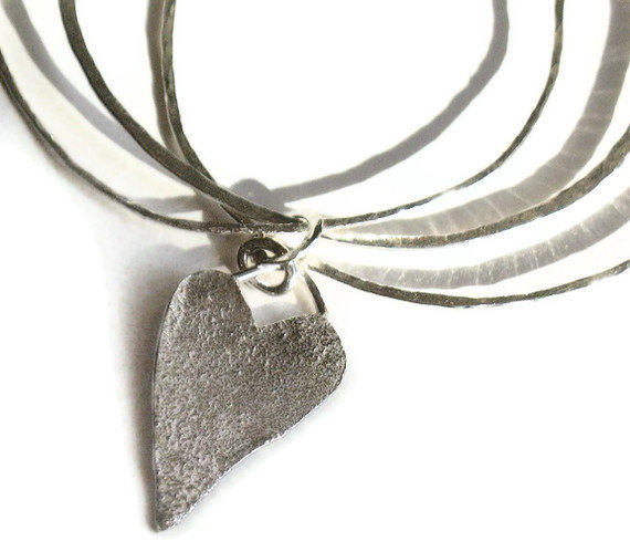 Three hand forged sterling silver bangles, cinched by a hammered band with a textured heart charm. The heart charm can be personalized with an initial or word.