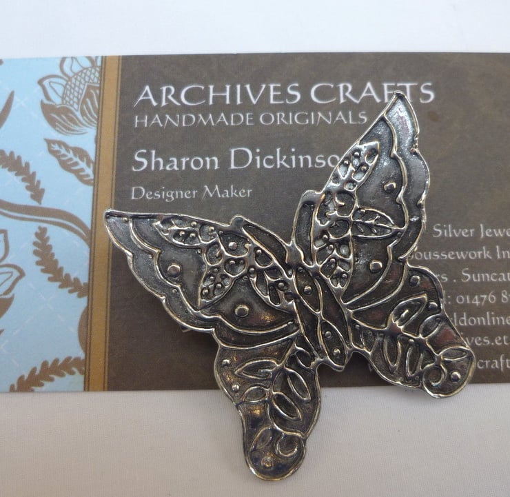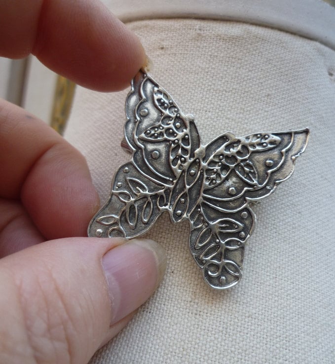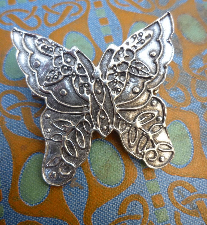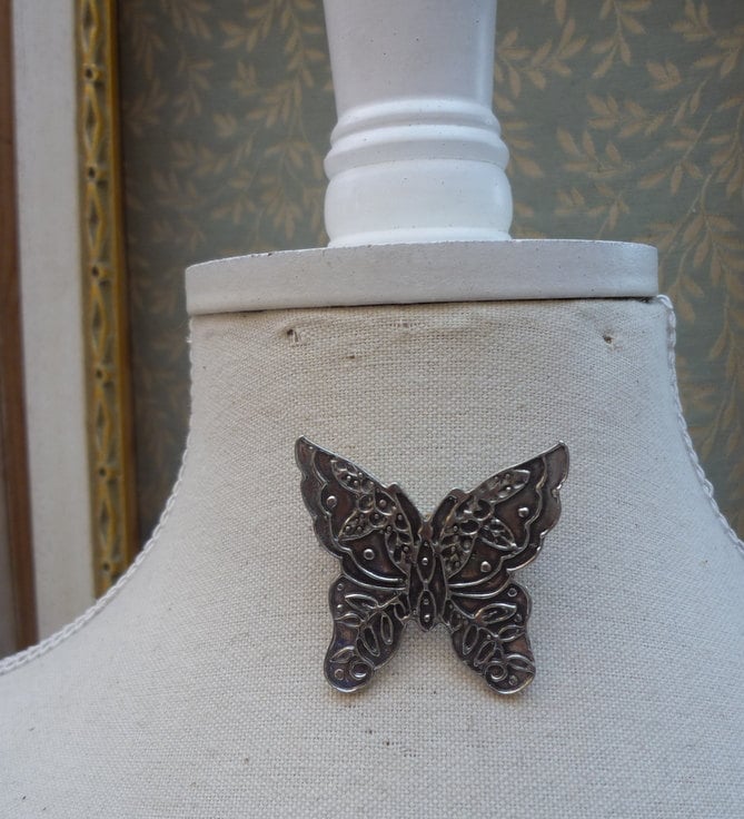 Pretty silver butterfly brooch with a deeply etched pattern giving an Art Noveau look to the piece