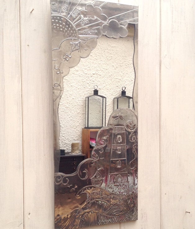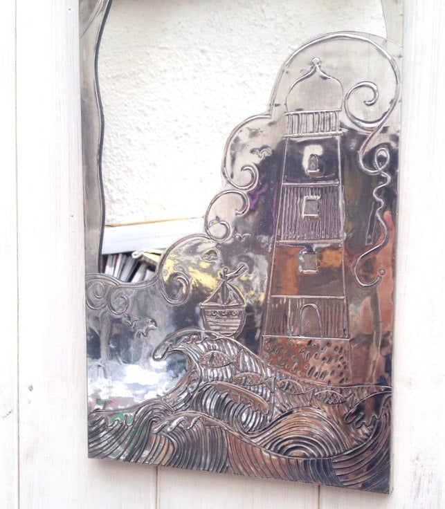 Lighthouse design bathroom mirror. Hand tooled pewter framed bathroom mirror.