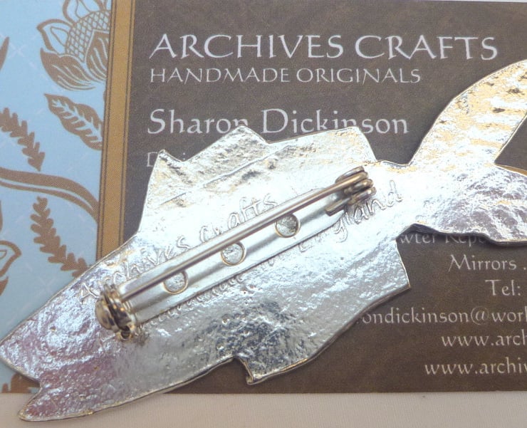 This brooch is made from fine English Pewter. I polish to give the metal and a high sheen then I give it some colour by carefully patinating with a combination of surface treatments. The brooch is then re polished which gives a beautiful vintage look to the metal. I really enjoy working in pewter, the colour is so mellow and the metal has a lovely warm feel when you hold it.