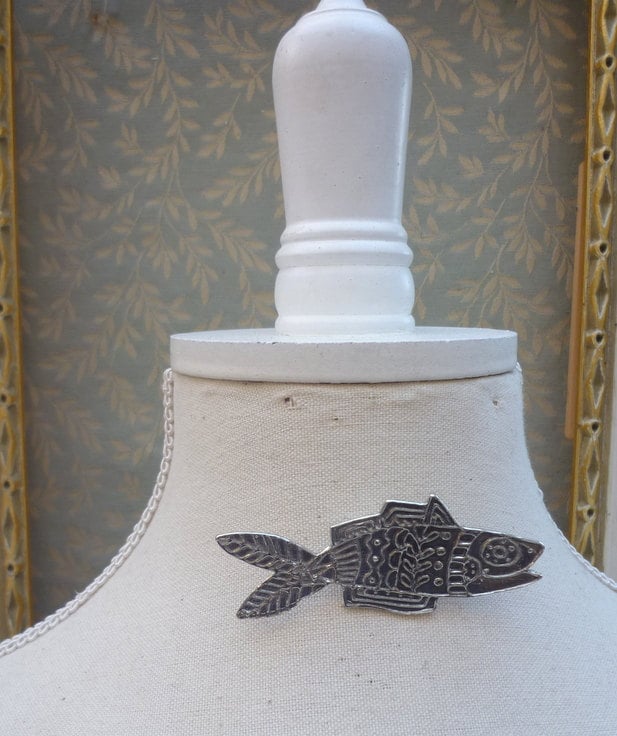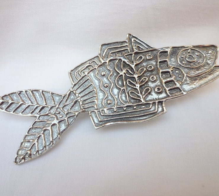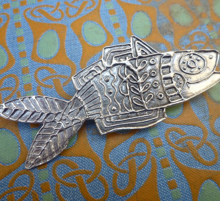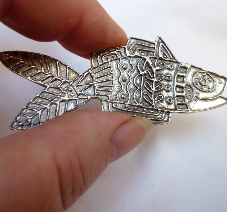 Happy fish brooch pin with a deeply etched intricate pattern. Shiny silver fish brooch made of English pewter......................... a unique and original design handmade by Sharon Dickinson.