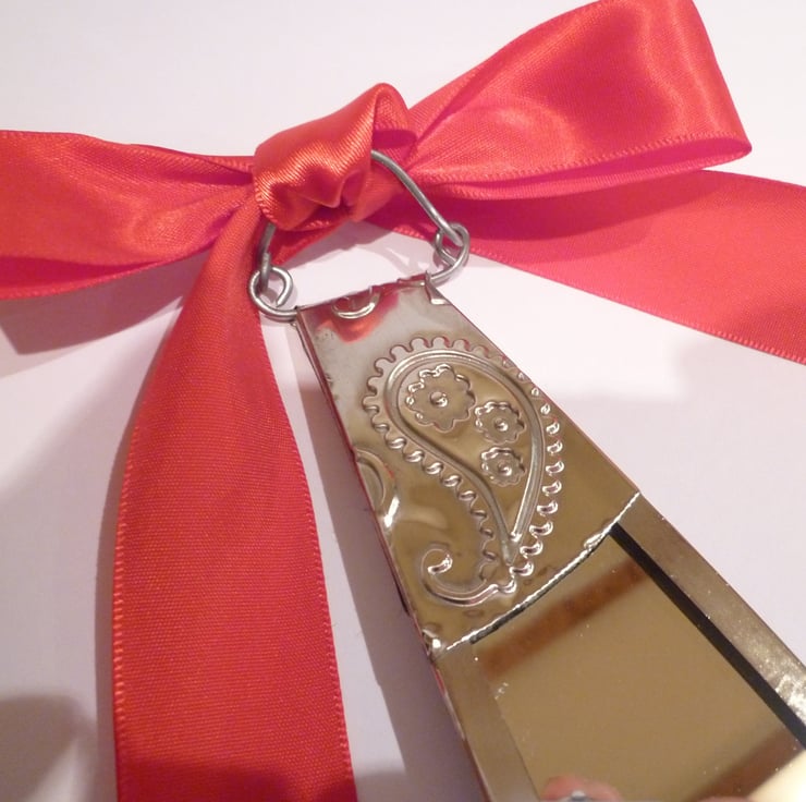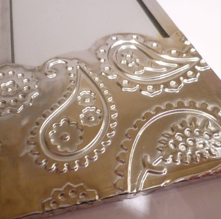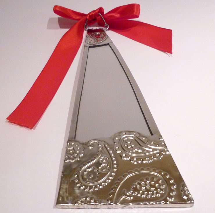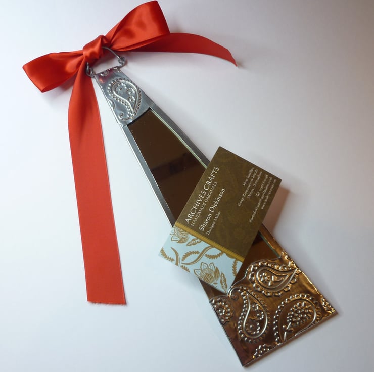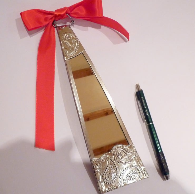 This paisley patterned mirror is approximately24 cm high by 7 cm across the base. Every one of my pewter mirrors is designed and hand tooled by me, not stamped hammered or cast. Because of the hand made nature of my work your mirror may vary slightly from the one pictured. You will receive a unique art mirror wrapped in tissue paper and tied with a bow . A lovely gift tag will bear the words,Mirror mirror on the wall, who is the fairest one of all?