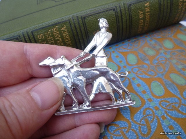 Elegant Art Deco style brooch pin featuring a smartly dressed woman walking a pair of sleek dogs, possibly salukis or wolfhounds.