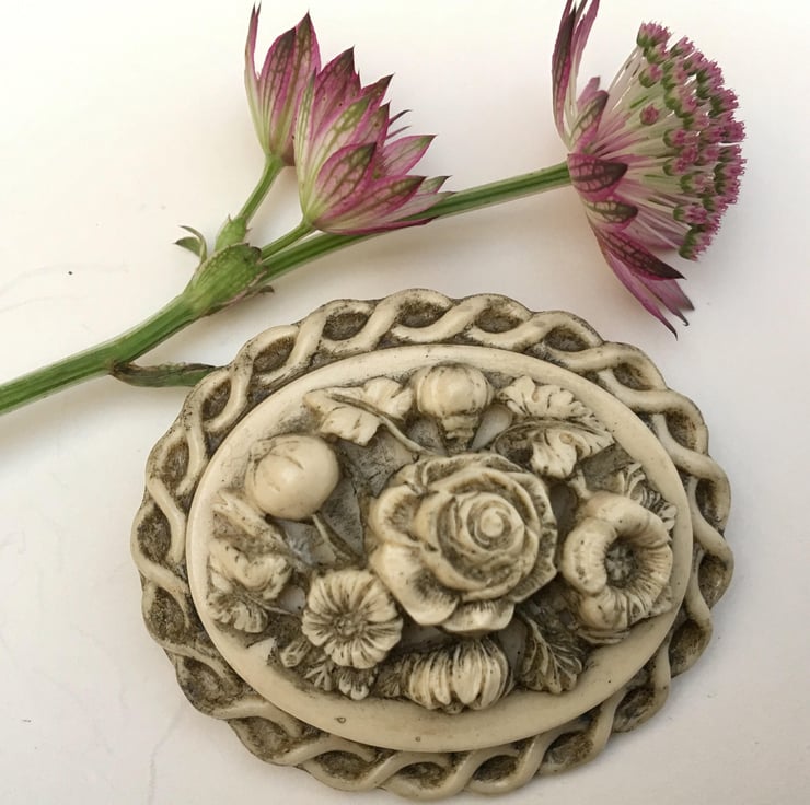It is a copy of an original Victorian brooch which was made from Jet, l have painted and antiqued this one to imitate the look of bone, however l can supply in black as per the original.