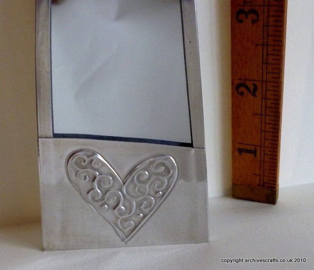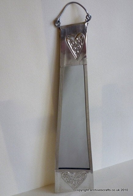 Delightful one of a kind hand tooled pewter mirror, just big enough to do your makeup. Hang on a wall a knob on a cupboard, dangle from a ribbon as a sun catcher, hang it on your tree or simply prop it up where needed.
