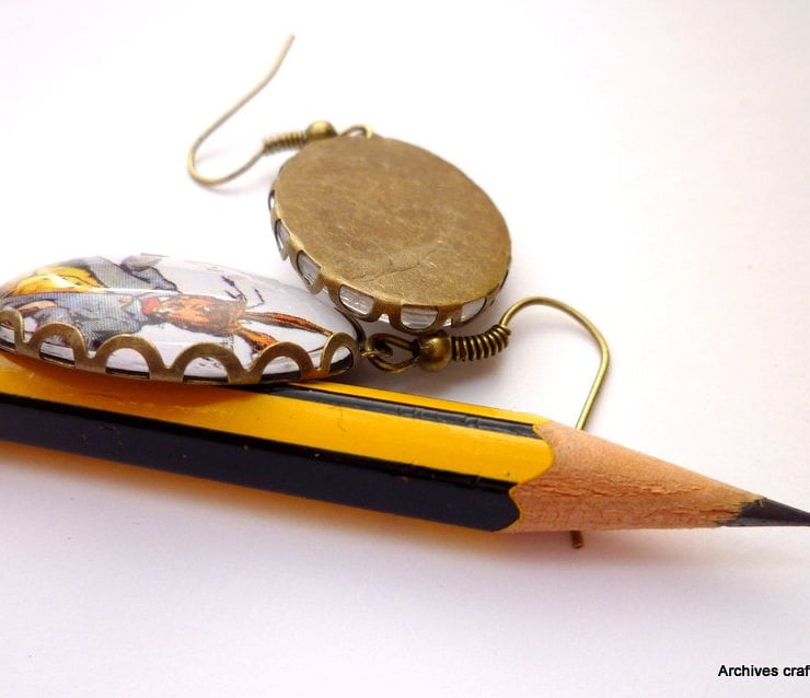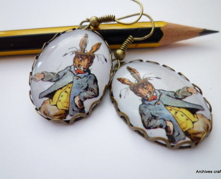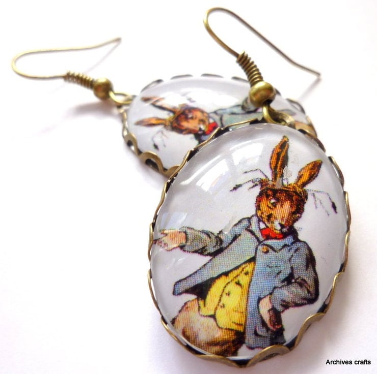 March Hare dangle earrings from the famous Alice in Wonderland story by Charles Dodson. Here are images of Teniels illustration of the Mad March Hare captured in resin and finished with magnifying crystal glass domes. The pictures are set in antique bronze settings measuring 18 x 25 mm and hang from elegant gold plated hook wires which allow them to move and catch the light.