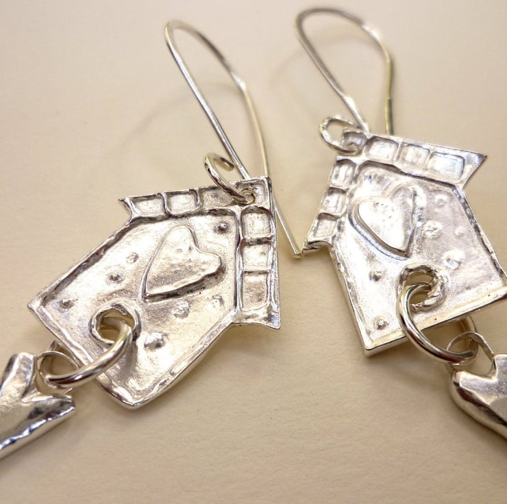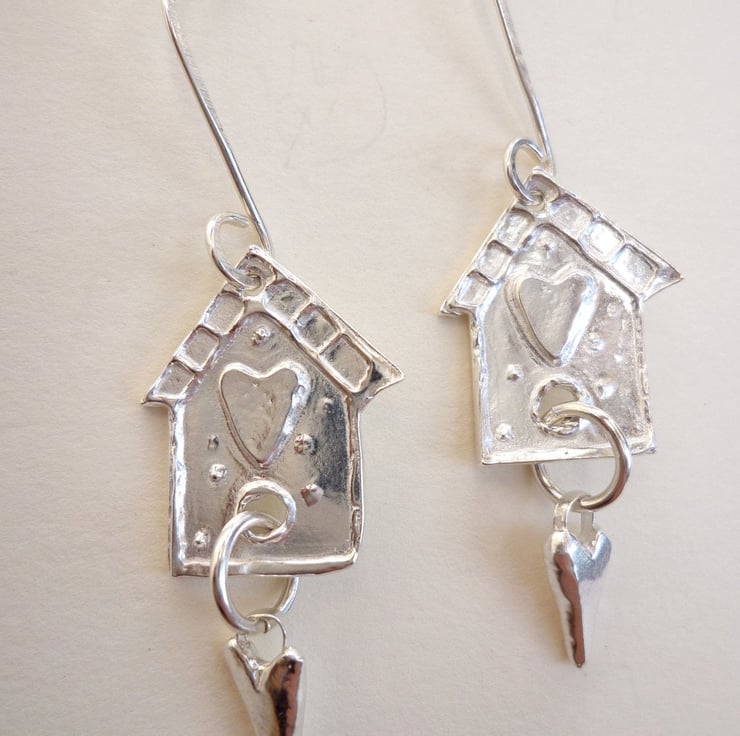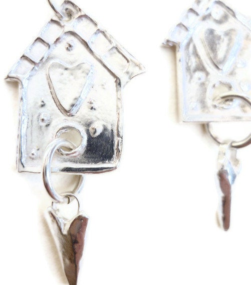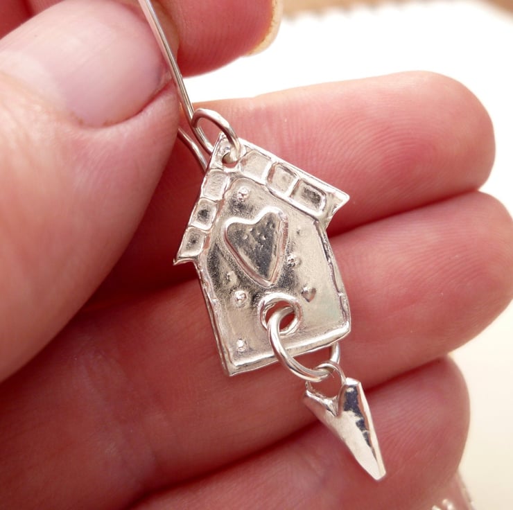 Fine silver dangle earrings in the shape of a little bird house with tiny dangling hearts.