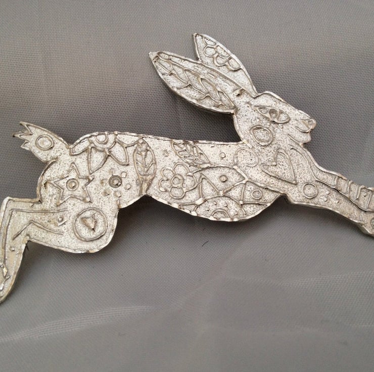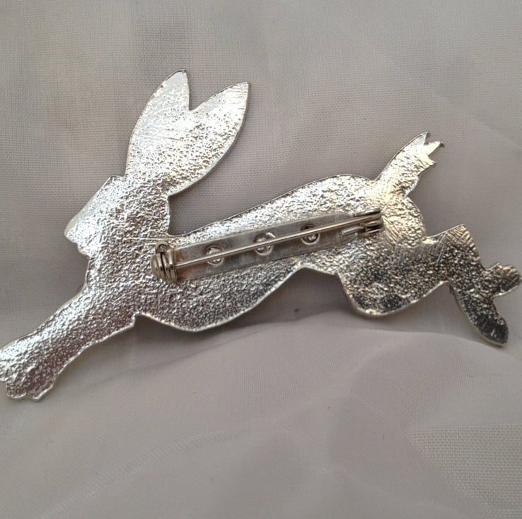 This Hare brooch is just short of 3 inches long and 1 34 inches high. The steel brooch bar o