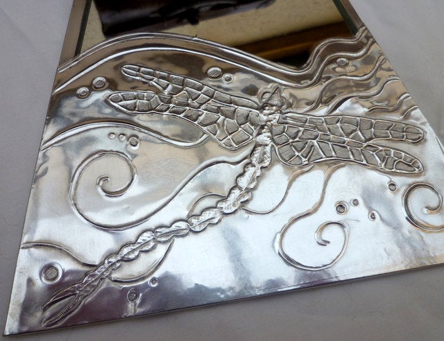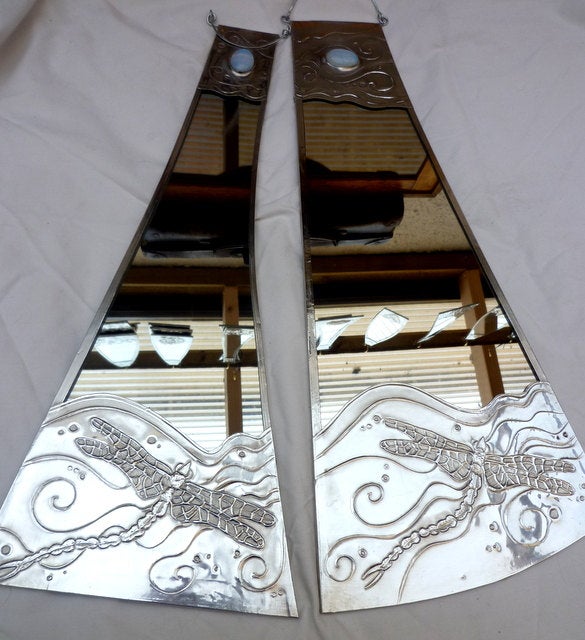 Wall mirror adorned with a beautiful pewter dragonfly. I have included images of 3 different pewter dragonfly mirrors each of which has a lovely sea opal stone set in to the pewter at the top.