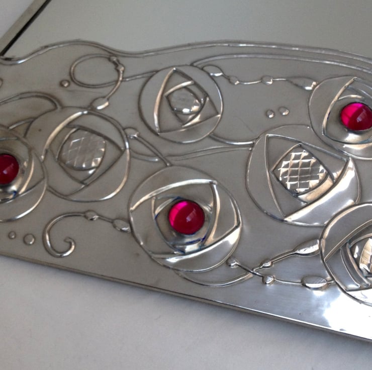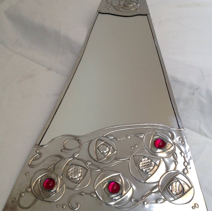 Bathroom mirror in Macintosh rose design. Pewter edged mirror decorated with relief pewter Glasgow rose design.