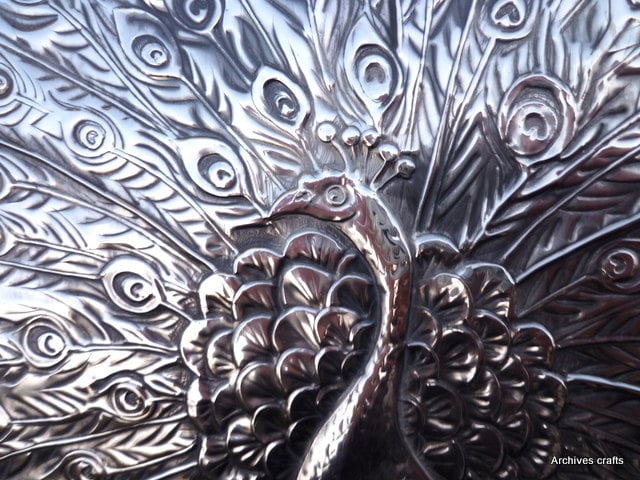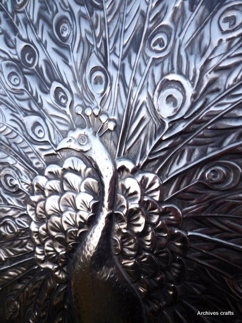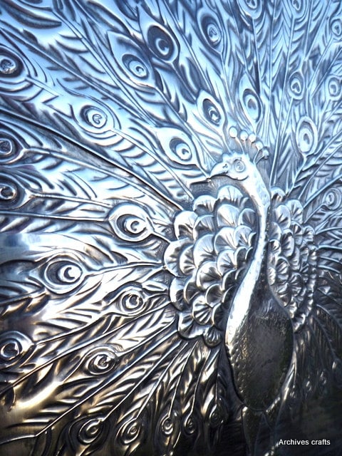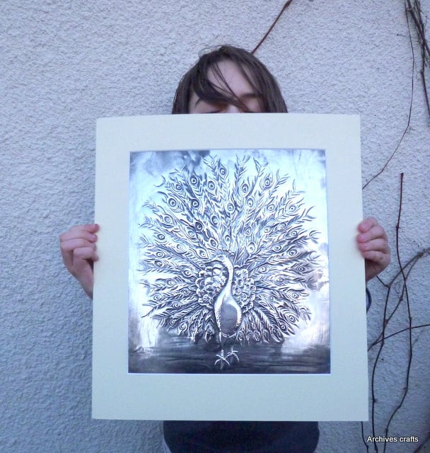 Peacock metal wall art plaque picture made of pewter sheet. The peacock is in bas relief, I use a technique called repousse work to make the art work stand out.