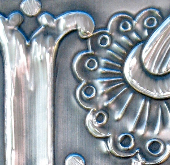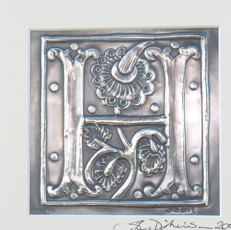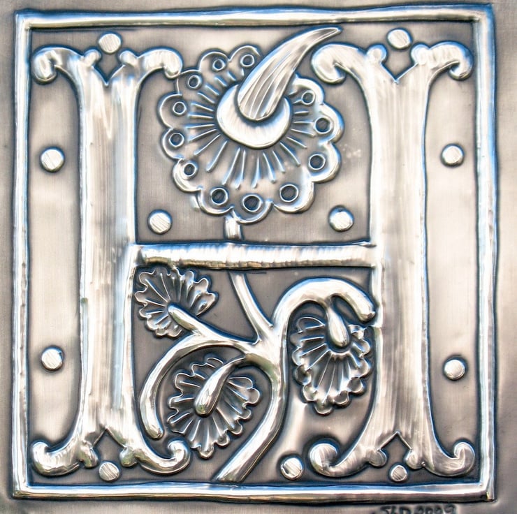 English pewter repoussework (raised work) plaquepicture of an elaborate letter H.
