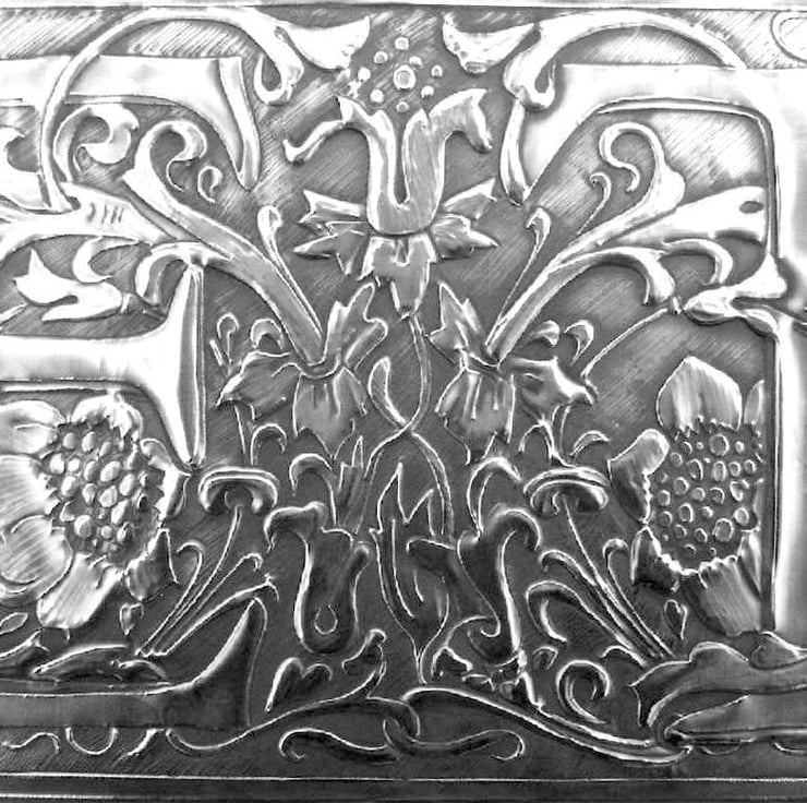 English pewter is a really beautiful metal, it has a lustrous silver sheen which I carefully treat and patinate to bring out the three dimensional qualities of the (raised) repouss metal work before hand polishing.