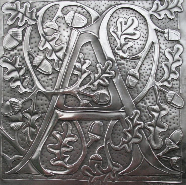 Arts and Crafts style letter A entwined with Oak leaves and acorns. A unique and original artwork made of pewter. This pewter repoussework (raised work) letter A would make a fabulous christening present, special birthday gift or graduation present.
