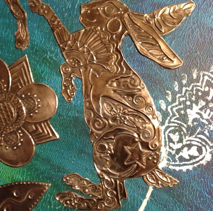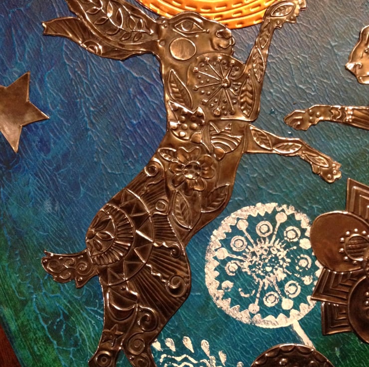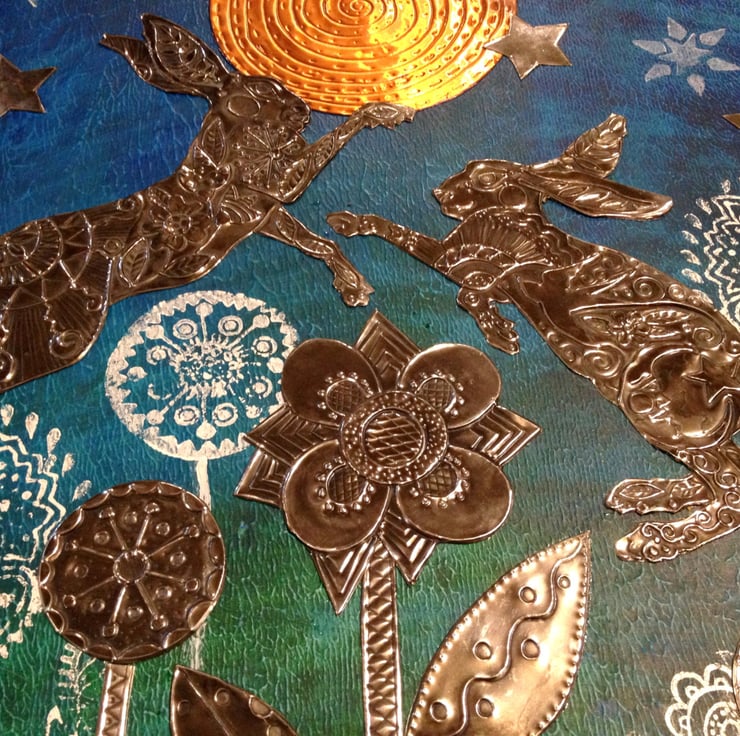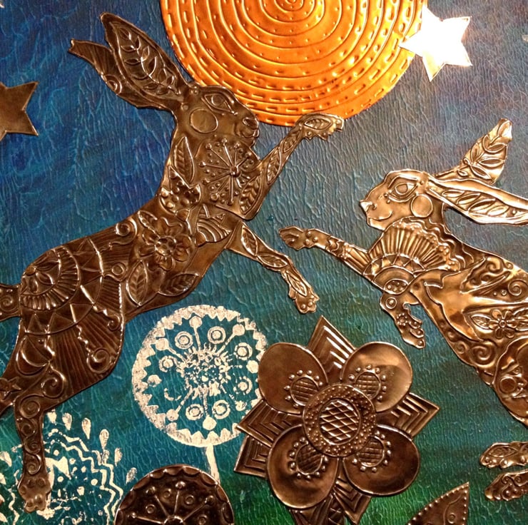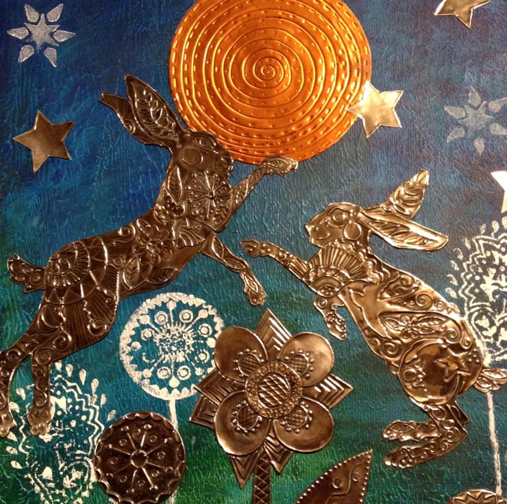 Multimedia original art work of two fabulously decorated 'Mad March hares'. The hares are made from English pewter and are decorated with images referencing the many folk tales and legends that abound around hares.