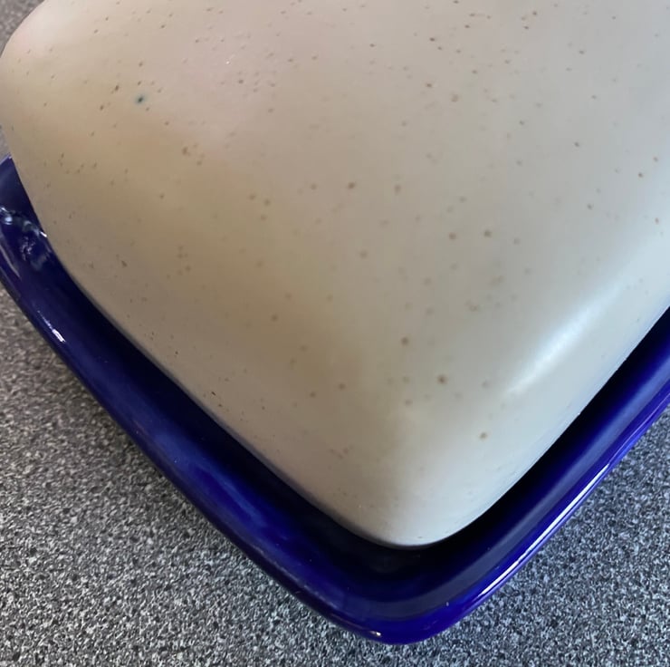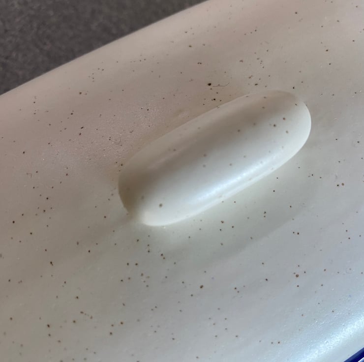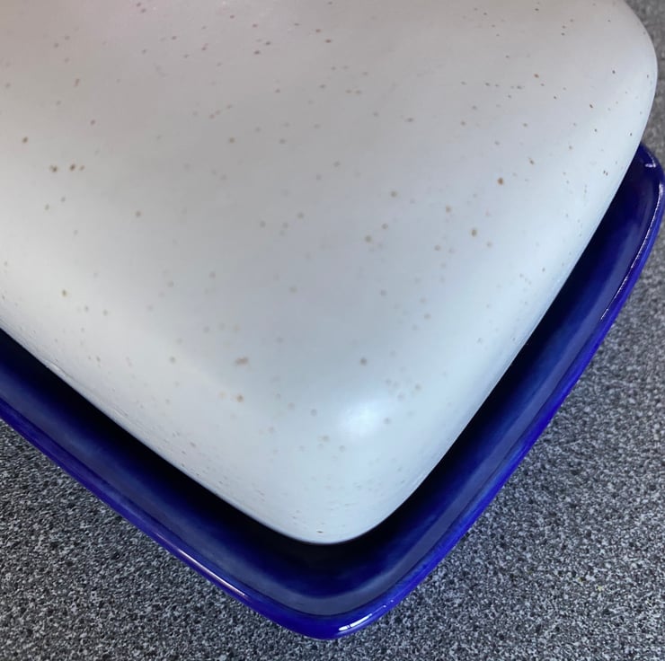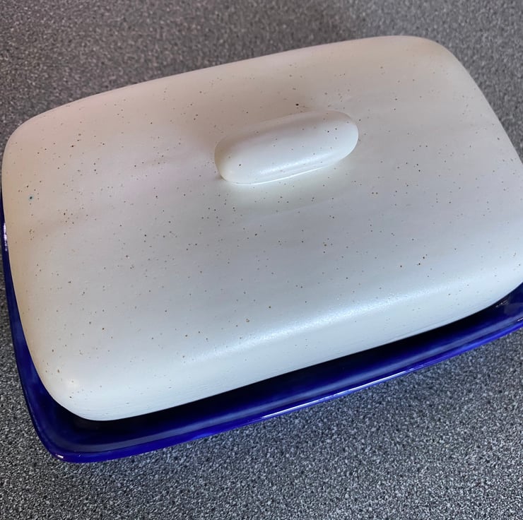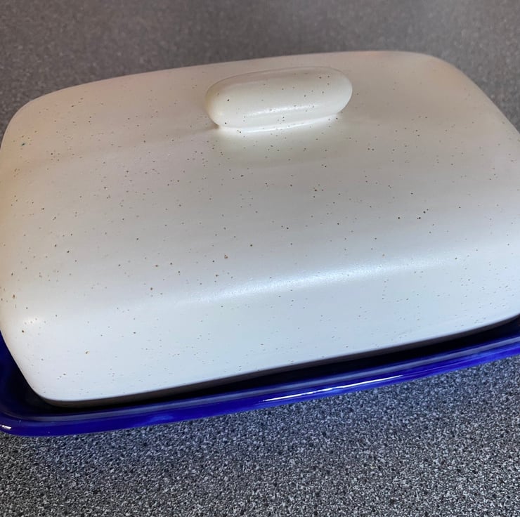 A uniquely designed ceramic butter dish with lid is an earthenware dish, pottery butter dish with a smooth surface lid in speckled white ceramic glaze with a royal blue glazed dish. This butter dish is an ideal tableware gift for any couple looking for a covered butter dish or butter keeper.