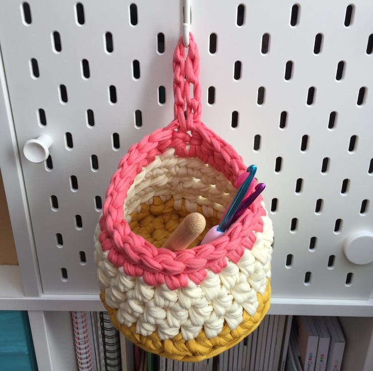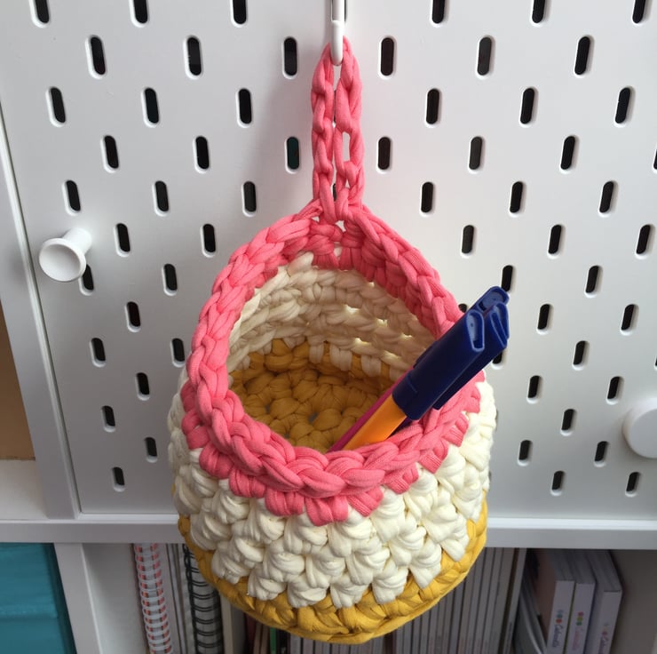 A small crochet hanging basket, perfect to hang on your pegboard, door handle or hook to store pens, craft items or keys. You could even pop in a small plant or jam jar of fresh flowers to brighten up your room!