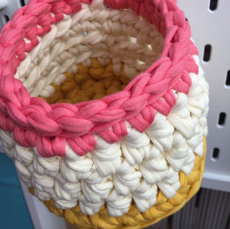 The yarns used for this basket are mustard yellow, pale lemon yellow and light coral pink. I can make these in any colour - message me for details!