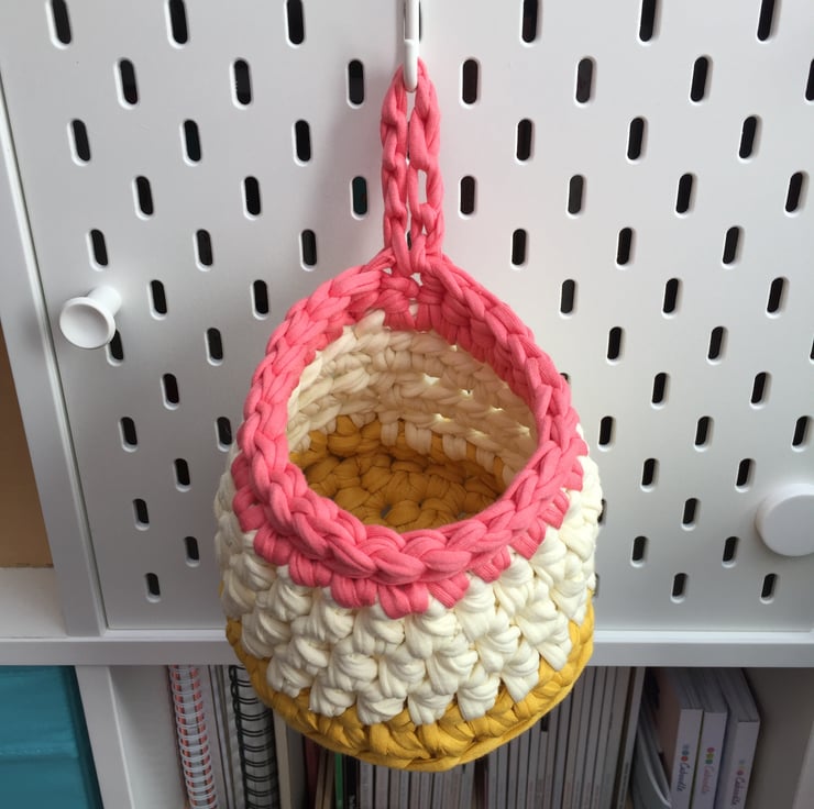 Small crochet hanging basket, pegboard basket - yellow and pink