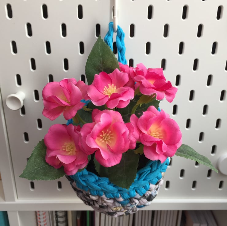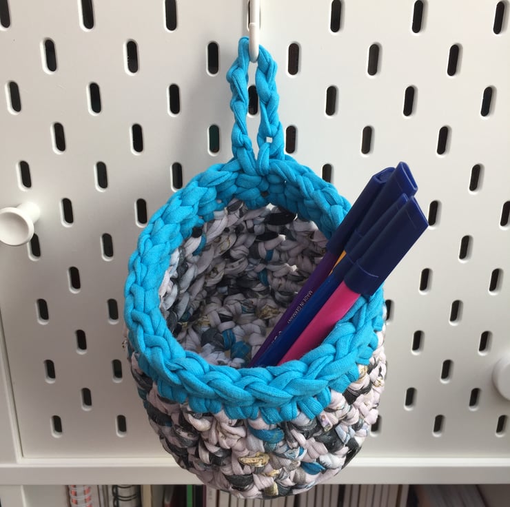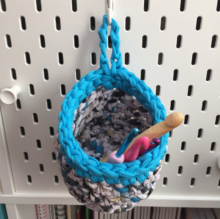 A small crochet hanging basket, perfect to hang on your pegboard, door handle or hook to store pens, craft items or keys. You could even pop in a small plant or jam jar of fresh flowers to brighten up your room!