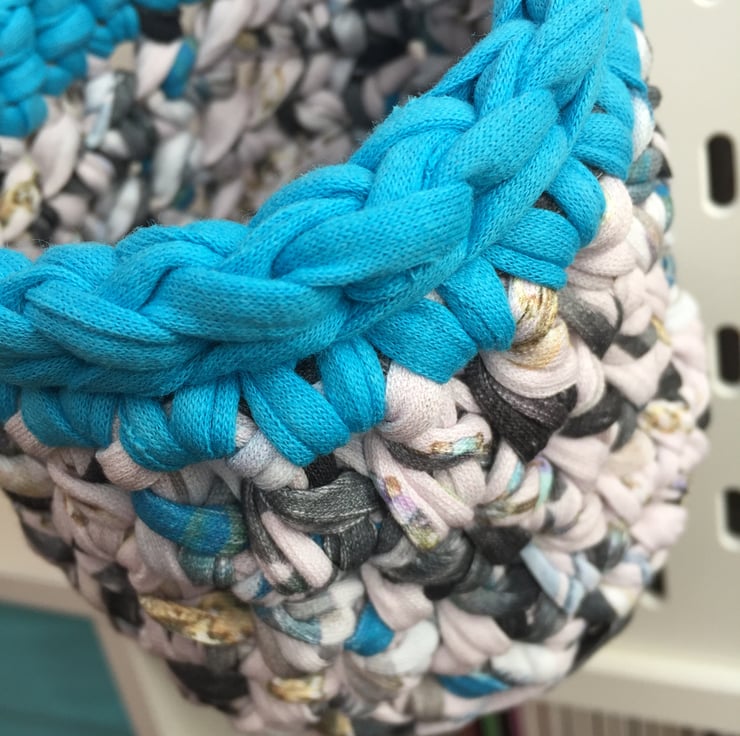 The yarns used for this basket are turquoise blue and a patterned fabric with hints of pale pink, turquoise, dark grey, yellow and purple. I can make these in any colour - message me for details!