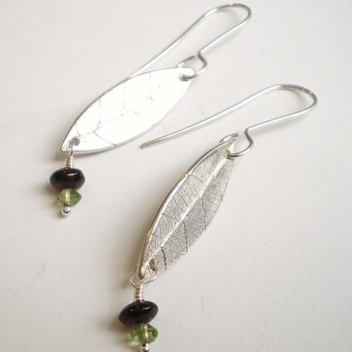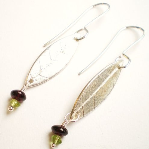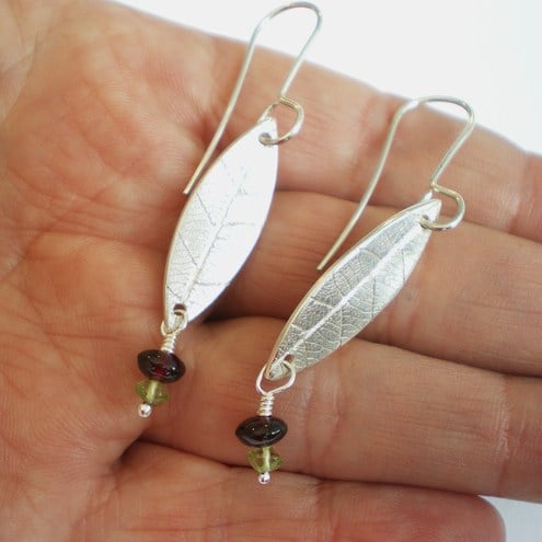 Recycled fine silver leaf shaped and textured earrings with peridot and garnet.
