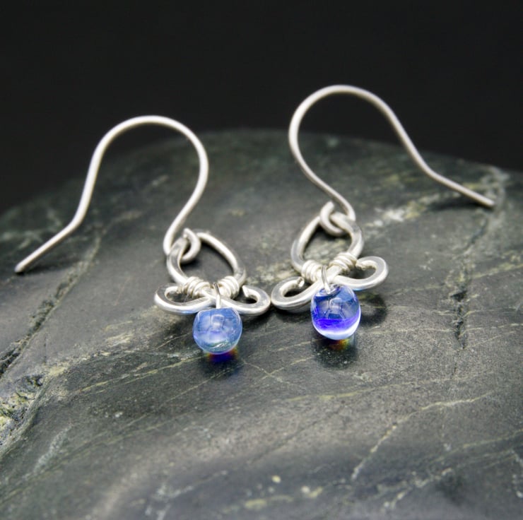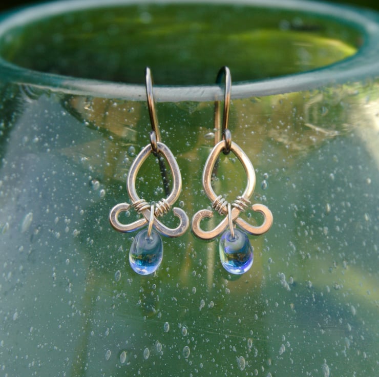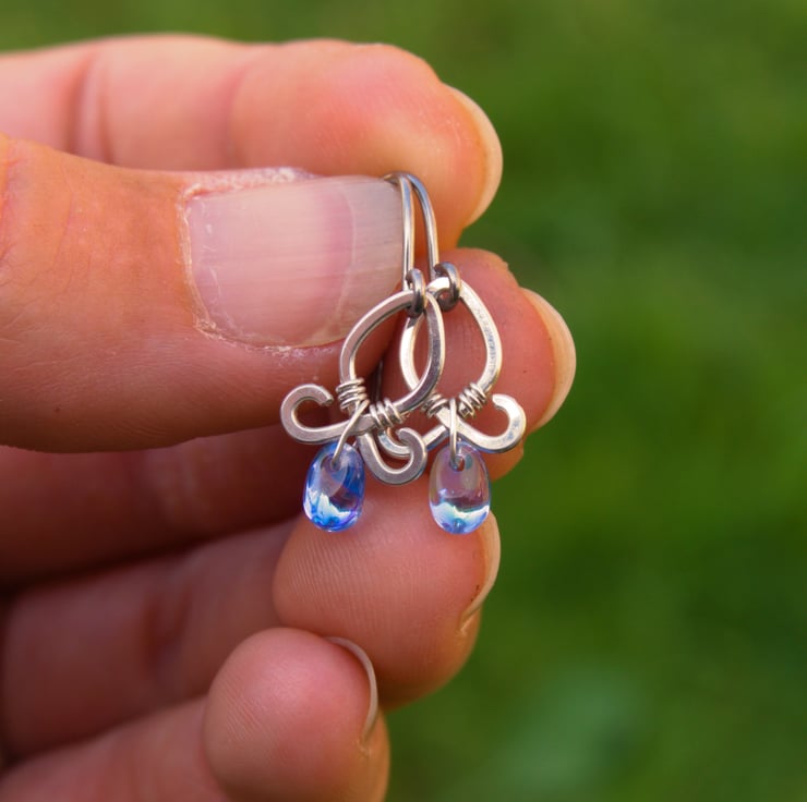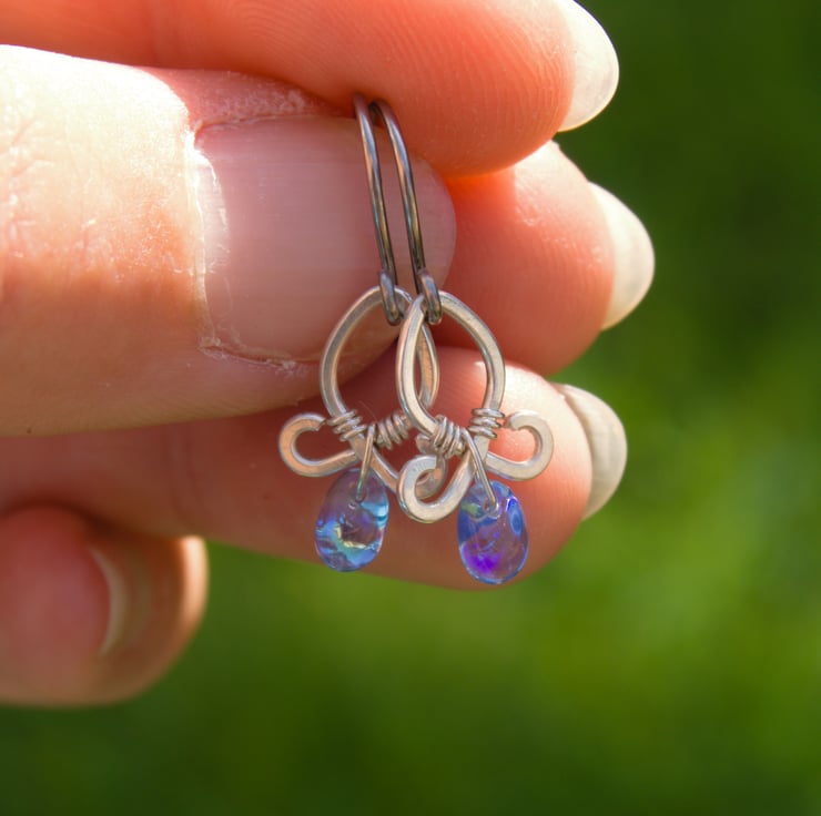 These dainty little drop earrings have been made from sterling silver wire. I've formed matching drop shapes, hammered them flat & then attached small glass beads with fine sterling silver wire. The beads are pale blue with an 'AB' finish - AB actually stands for Aurora Borealis as the finish adds a prismatic effect giving a beautiful mirror shimmer!