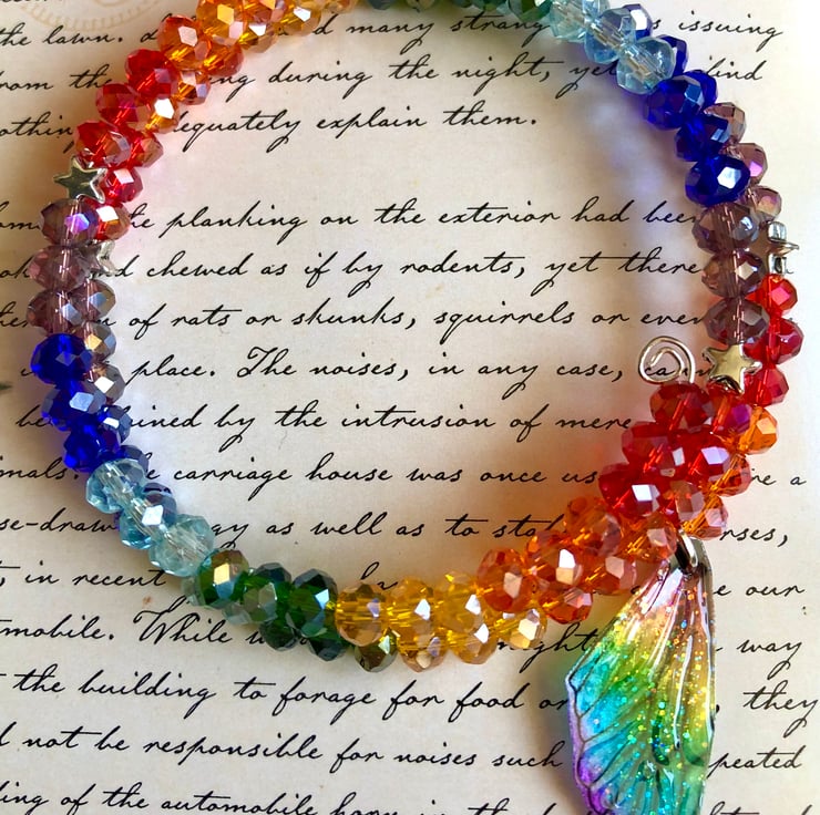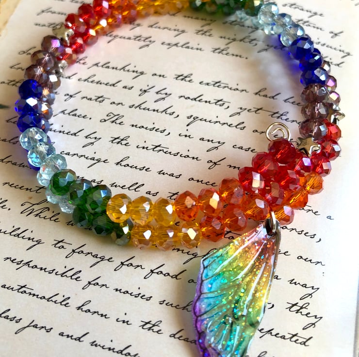 I have added lots of sparkling faceted Czech glass beads in lots of rainbow colours. I have also added some little star spacer beads and a dainty rainbow fairy wing that has been glazed. Tiny little pieces of iridescent glitter sparkle beneath the wings shiny surface to add that extra touch of magic.