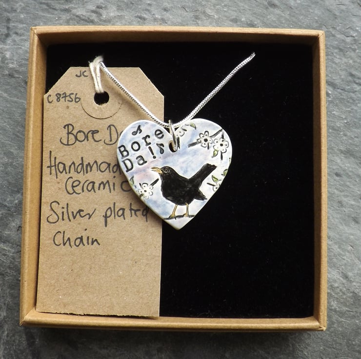 Handmade Ceramic Bore Da Blackbird heart pendant