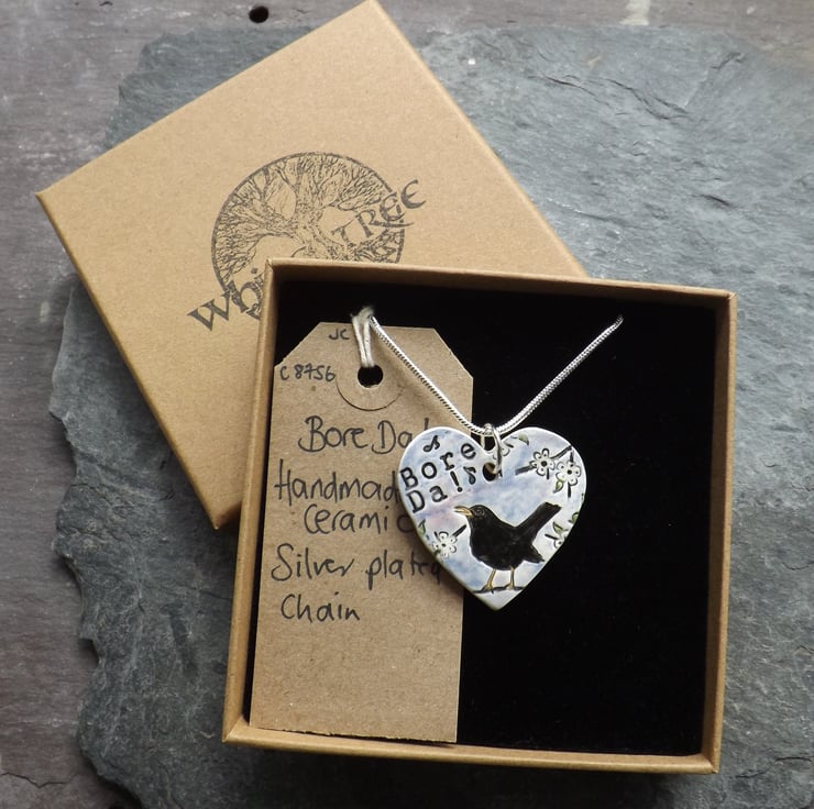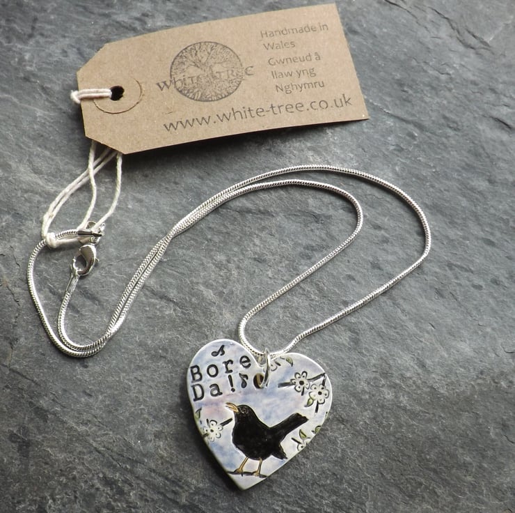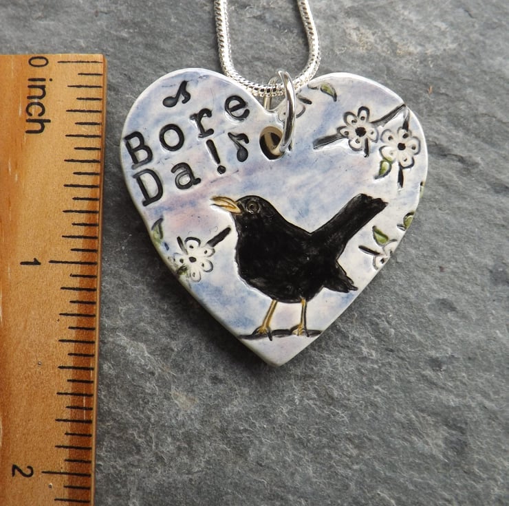 This pretty heart pendant features a blackbird amongst the blackthorn blossom, singing "Bore Da!". As with all my jewellery it is made and decorated entirely by hand.