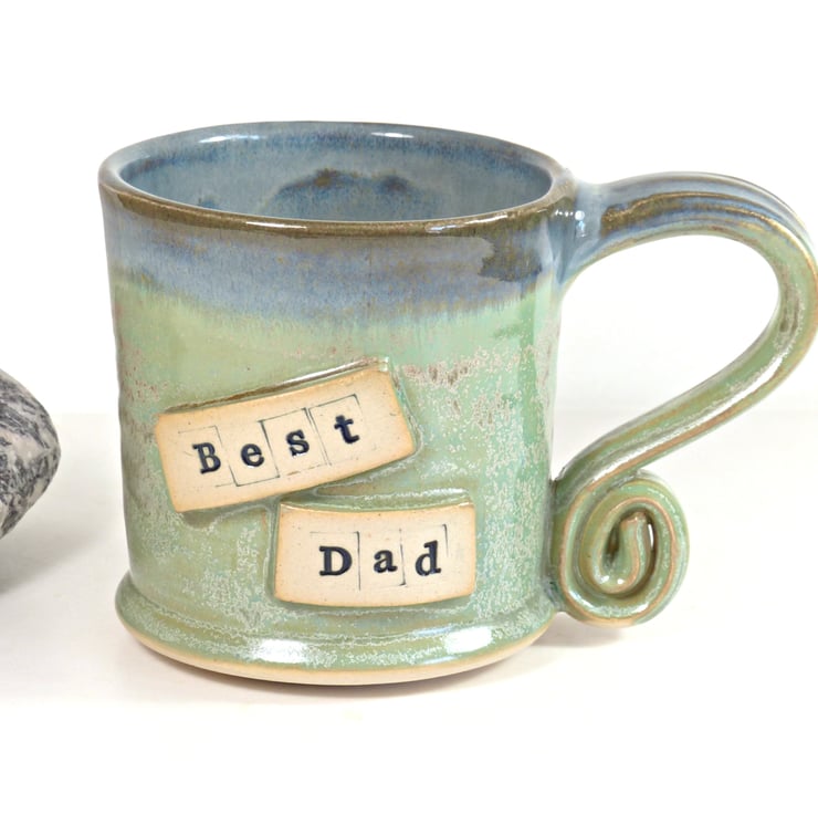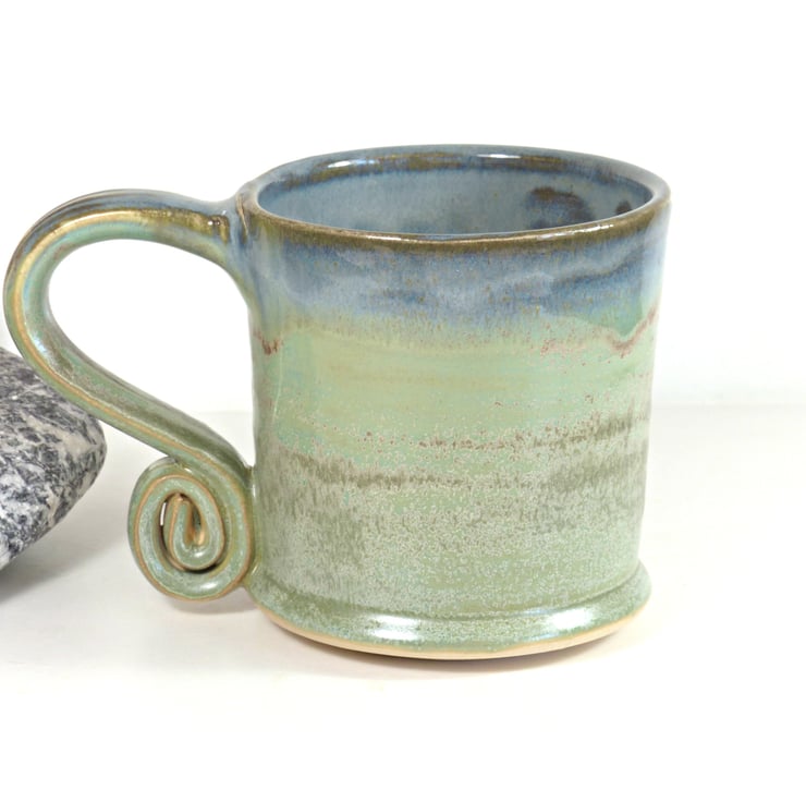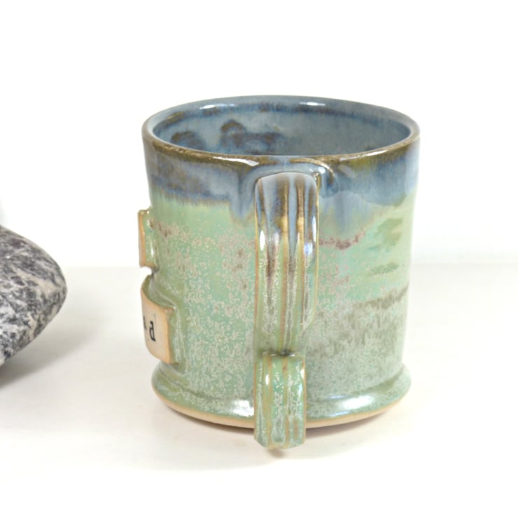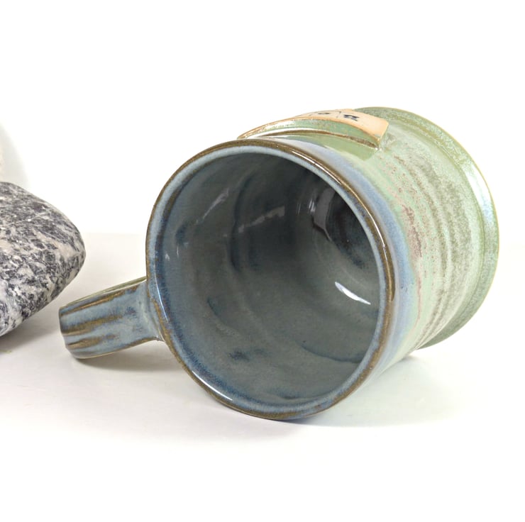 The mug was then fired to 1000C to what is called bisque ware. The base and design were waxed and I then glazed with a lovely sweet green. It was then refired to 1240C. That's hot!