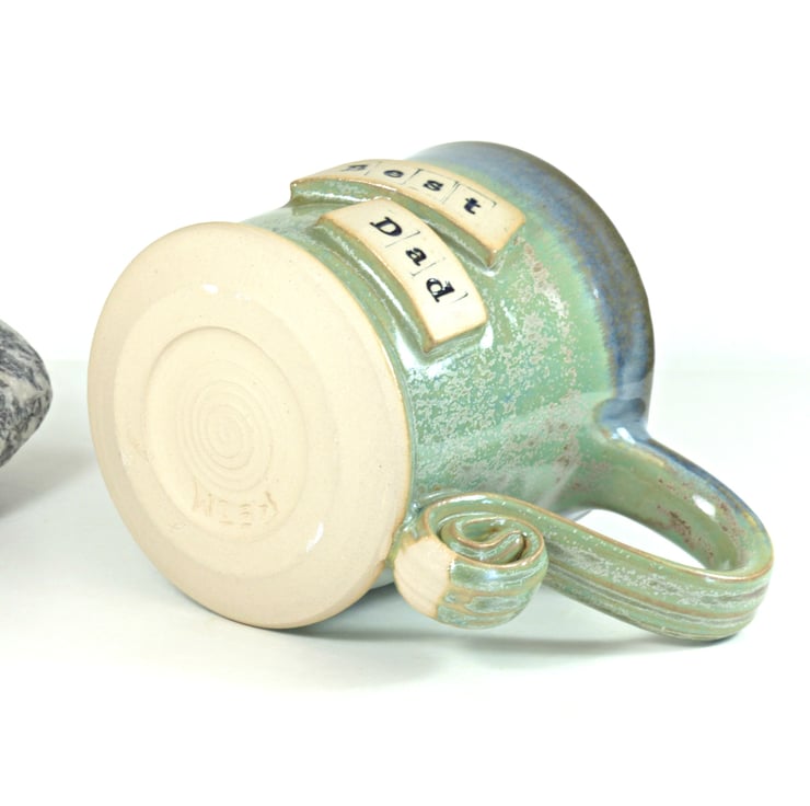 I threw the body on the wheel using a lovely stoneware white clay. Stoneware clay makes for a very strong and durable mug. I then trimmed the base and pulled a handle before attaching the decoration.