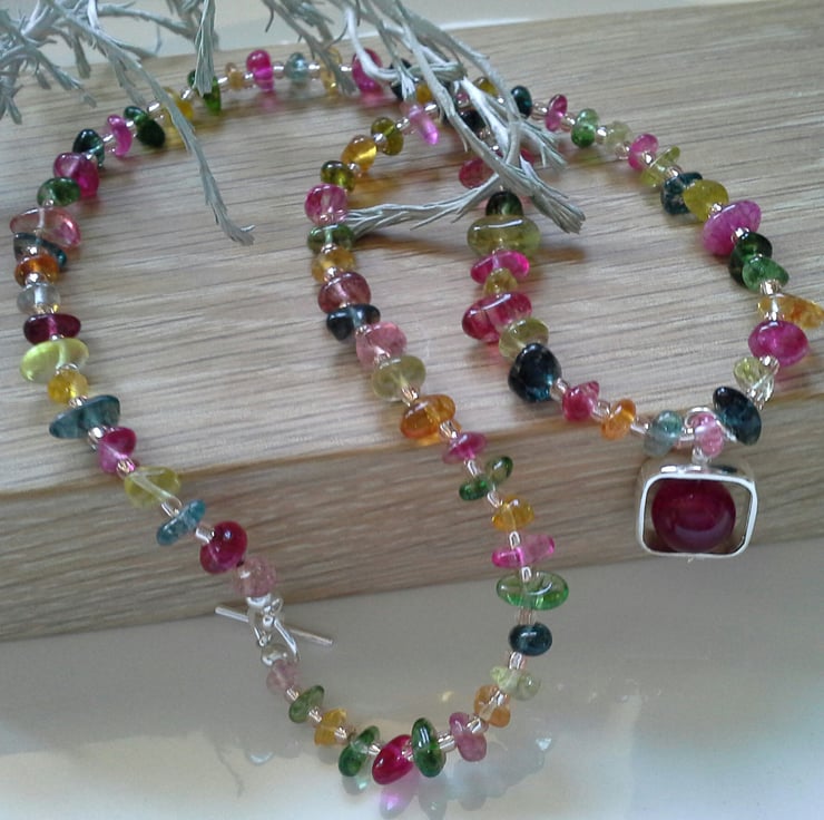 A lovely attractive colourful expensive looking necklace designed and lovingly hand crafted using multicoloured tumbled pebble genuine quartz and seed beads. The necklace has a hand made silver plated pendent created from single components with a 8 mm round red quartz gemstone bead in the centre. For the main construction coated professional stainless steel jewellers wire has been used for added strength and lasting durability, finished of with a round quality silver plated toggle style clasp.