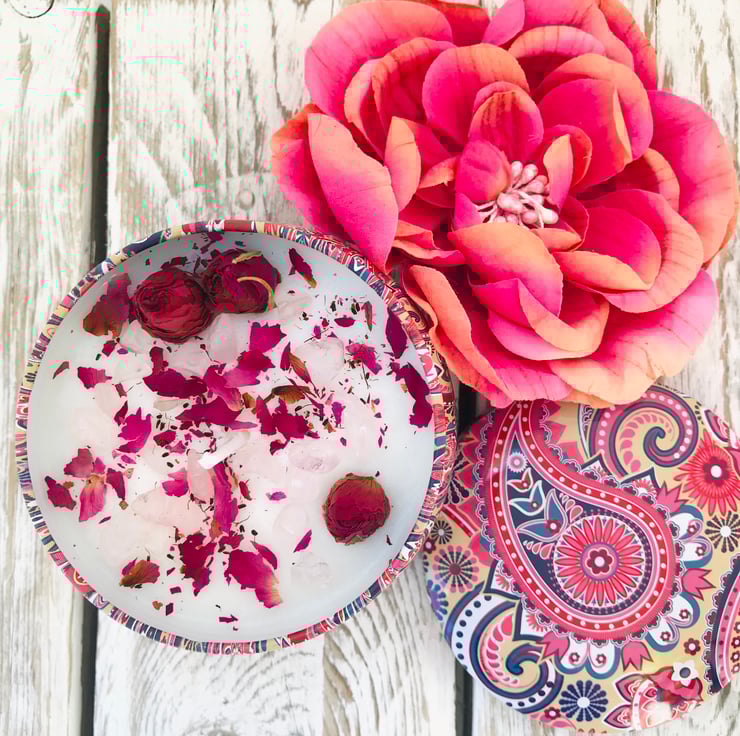 The coconut wax candle is embedded with Rose and Clear Quartz and Flourite healing crystals and stones and sprinkling of botanicals which compliment the spa inspired fragrance.