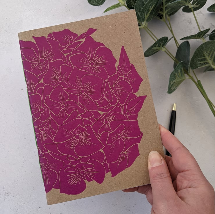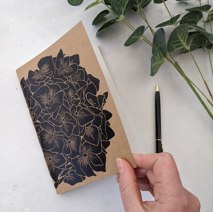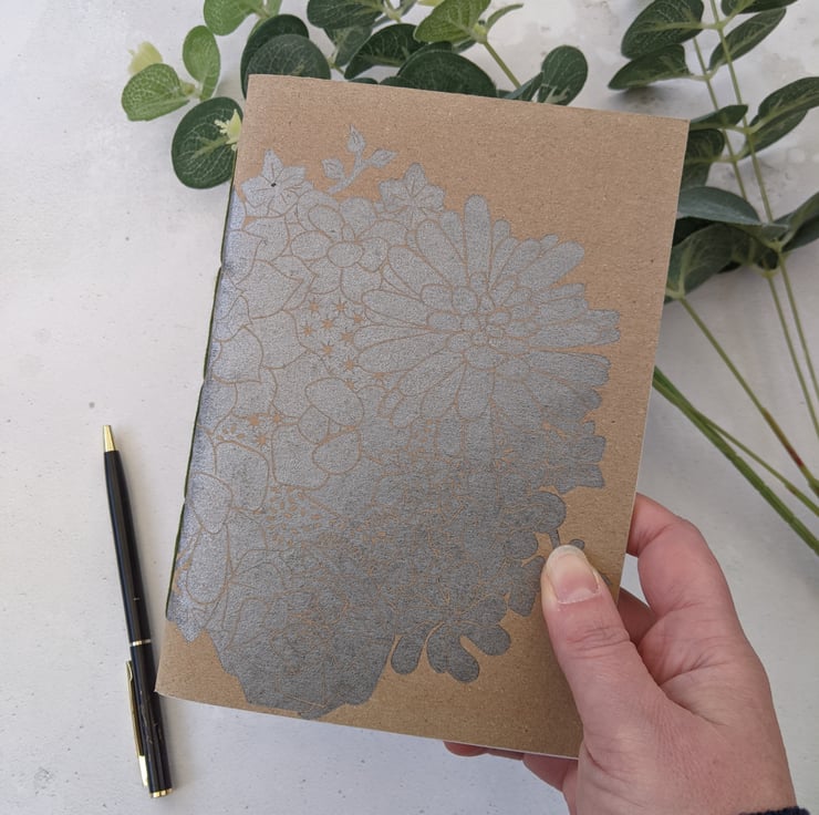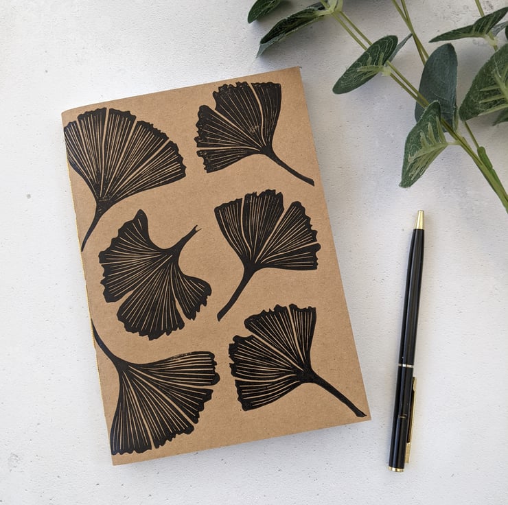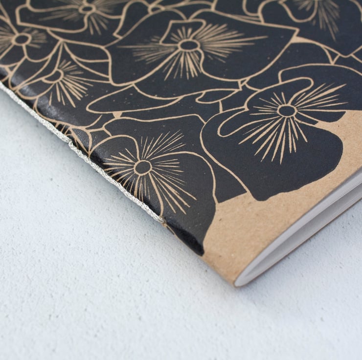 Handmade notebook / sketchbook with a botanical design, hand carved in lino.